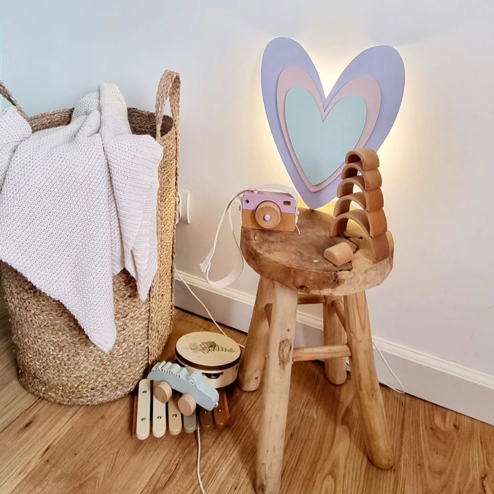 Drewniana lampka LED Serce tęczowe – kolorowa magia w dziecięcym pokoju