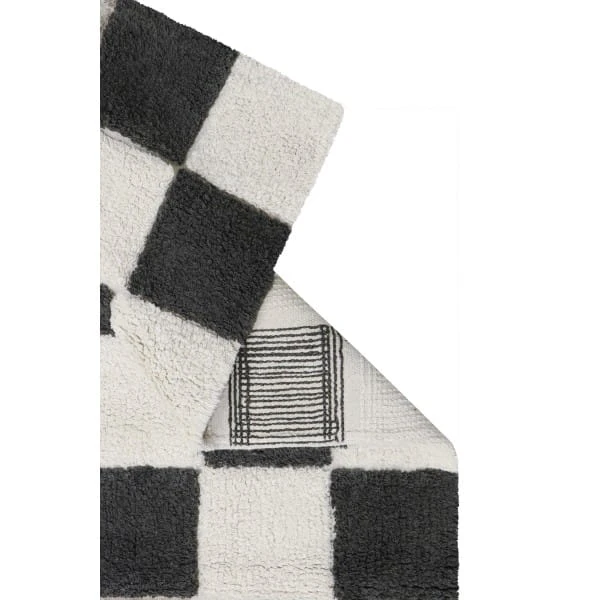 Dywan bawełniany przypominający szachownicę lub dla amatorów gotowania - płytki kuchenne w stylu vintage. Dywan szachownica w rozmiarze 120x160 cm, w kolorach ciemnej szarości i beżu będzie wspaniałym dodatkiem do pokoju dziecięcego. Uniwersalny wzór i kolorystyka pasować będzie zarówno do pokoju dziewczynki i nastolatki. Mięciutki i leciutki ręcznie wykonany dywan z bawełny i organicznych barwników jest hipoalergiczny i nie powoduje podrażnień delikatnej skóry dziecka. Dlatego świetnie się sprawdzi w pokojach niemowlaków, gdzie może służyć jako bezpieczne miejsce do zabawy. Dywan można prać w pralce, co pozwala w prosty sposób zachować go czystym i świeżym.
