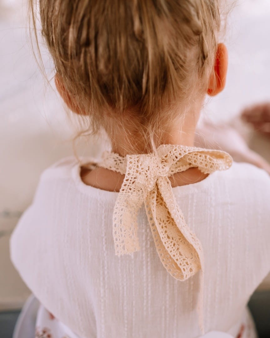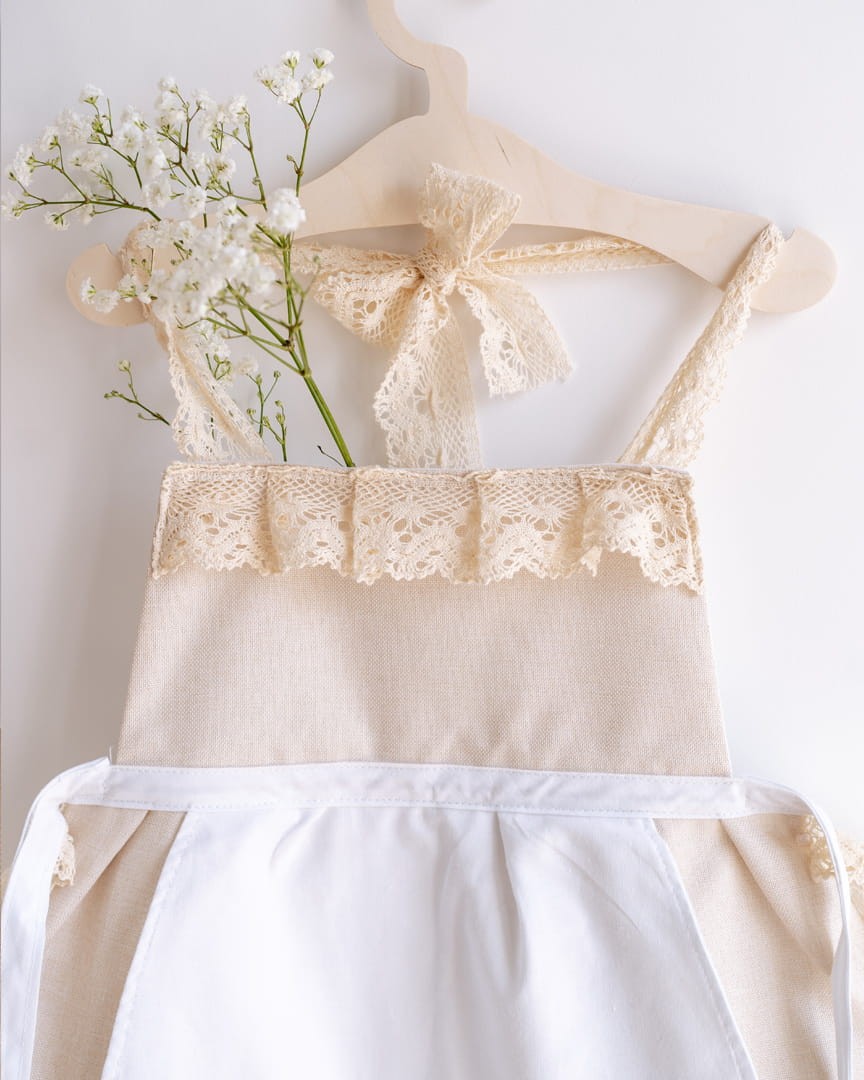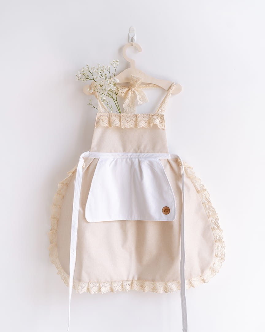 Praktyczna, duża kieszeń umieszczona z przodu fartuszka zapewni miejsce na przybory kuchenne, pędzle oraz inne przedmioty niezbędne do zabawy, pomocy w kuchni lub prac szkolnych. Kieszeń fartuszka oraz kołnierzyk wykonano z białej tkaniny bawełnianej. Fartuszek jest wykończony jasnobeżową koronką klockową. Fartuszek jest wiązany na szyi oraz na pleckach, jak klasyczny kuchenny fartuch.