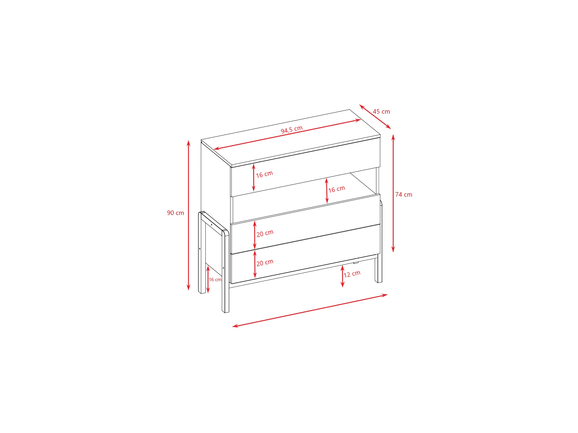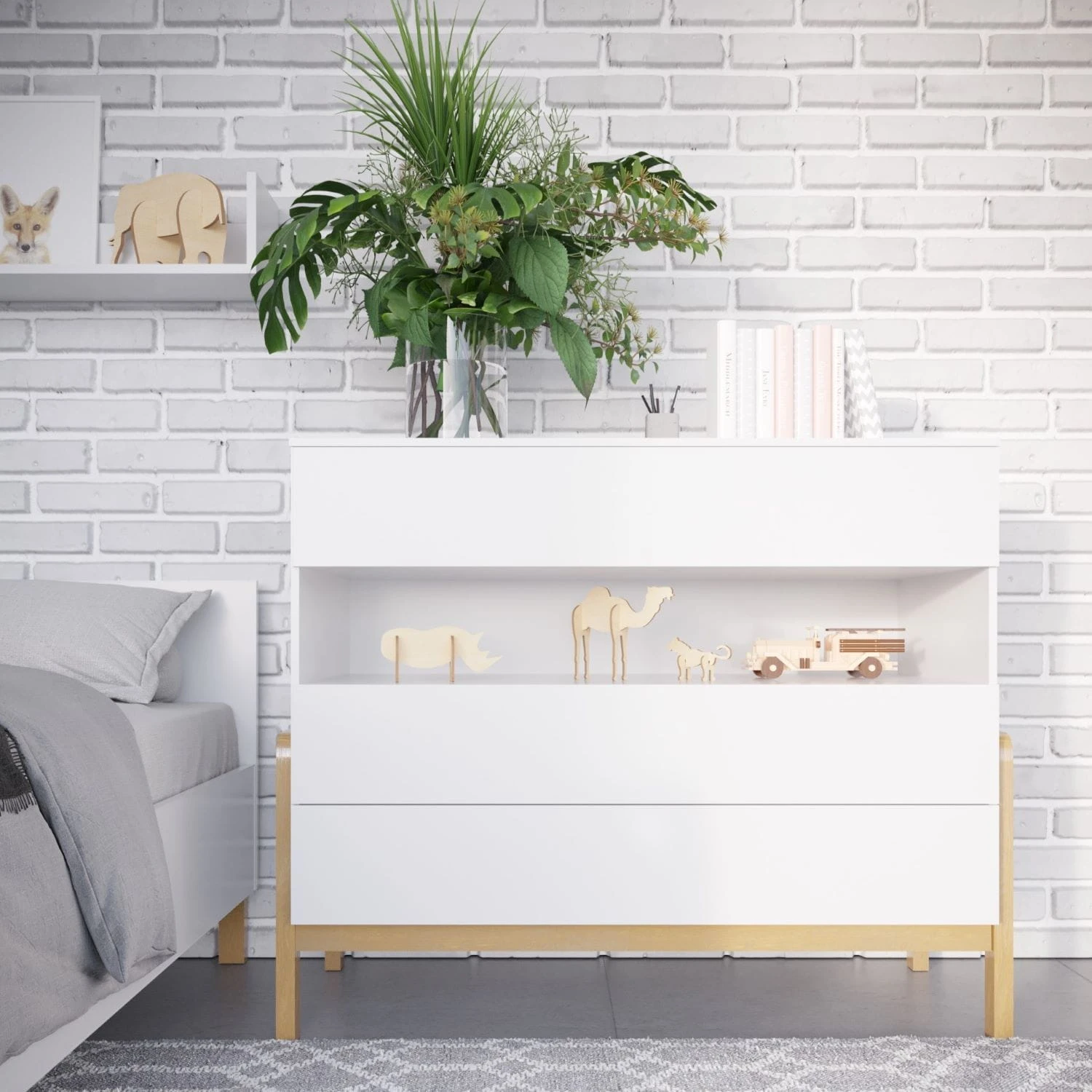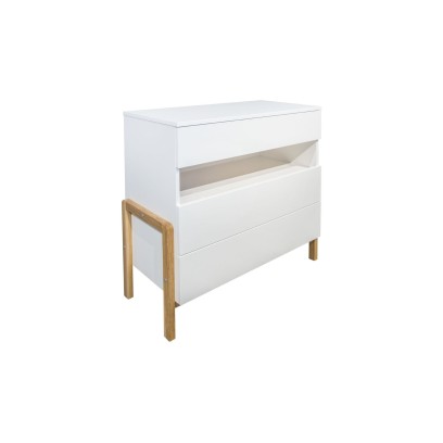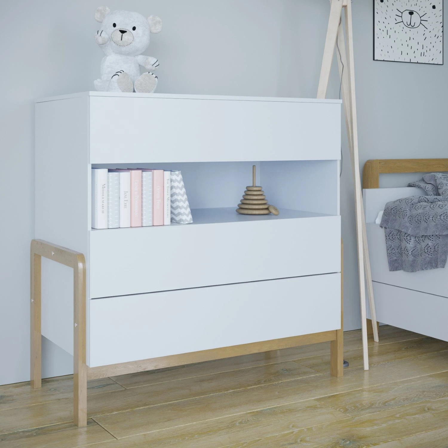 Komodę charakteryzuje prosta oraz ergonomiczna budowa, zapewniająca idealne miejsce na ubrania i rzeczy dziecka. Trzy pojemne szuflady o pełnym wysuwie i otwarta półka pozwalają na łatwy i szybki dostęp do schowanych w niej przedmiotów. Szuflady otwierają się za pomocą przesunięcia krawędzi mebla. Komoda wykonana jest z białej płyty laminowanej oraz nóg z litego drewna dębowego. Mebel wyposażony w system mocowania do ściany, zwiększający jego stabilność.