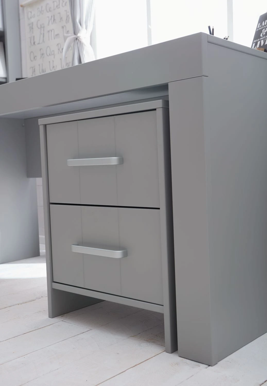 Kontener Calmo szary to praktyczny dodatek do biurka, który zwiększa wygodę i funkcjonalność w pokoju młodzieżowym. Dzięki dwóm pojemnym szufladom z systemem cichego zamykania pomaga utrzymać porządek i zorganizować przestrzeń do nauki. To element kolekcji mebli Calmo w kolorze szarym, idealnej do aranżacji nowoczesnego wnętrza nastolatka.