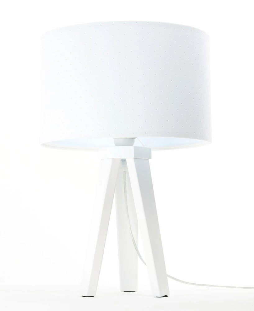 Ręcznie wykonany abażur z miękkiej, pikowanej tkaniny jaśminowej subtelnie rozprasza światło, tworząc sprzyjającą atmosferę do nauki, odpoczynku czy wieczornego czytania. Drewniana podstawa w formie stabilnego trójnogu dostępna jest w dwóch wersjach – naturalnej lub pomalowanej na biało. Dzięki temu lampka do pokoju młodzieżowego dopasuje się zarówno do nowoczesnych, jak i klasycznych aranżacji.