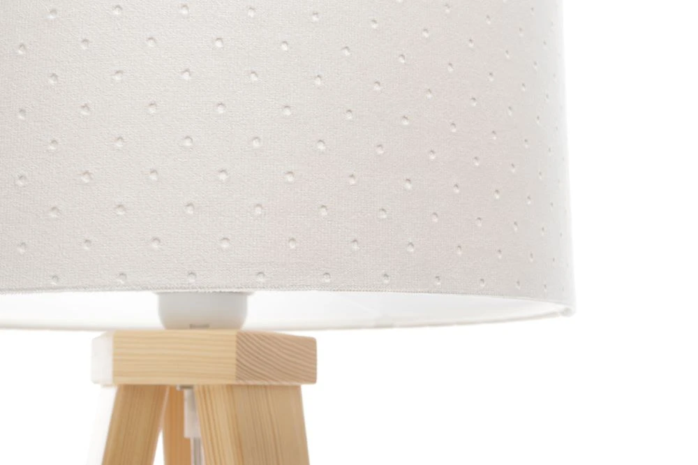 Ręcznie wykonany abażur z pikowanej tkaniny jaśminowej w kremowym kolorze subtelnie rozprasza światło, dzięki czemu wnętrze staje się bardziej przyjazne i wyciszone. Stabilna podstawa w formie trójnogu z drewna sosnowego – dostępna w kolorze naturalnym lub malowana na biało – nadaje całości elegancji i naturalności.