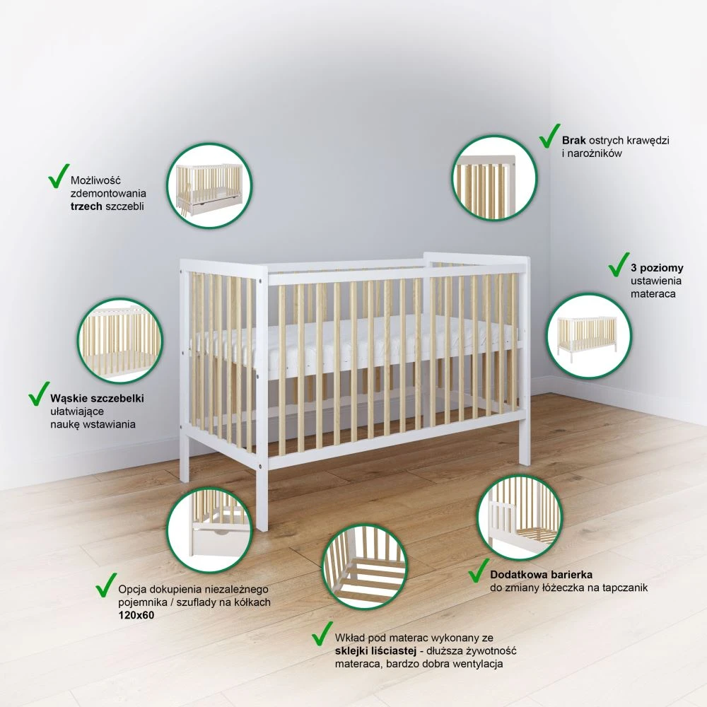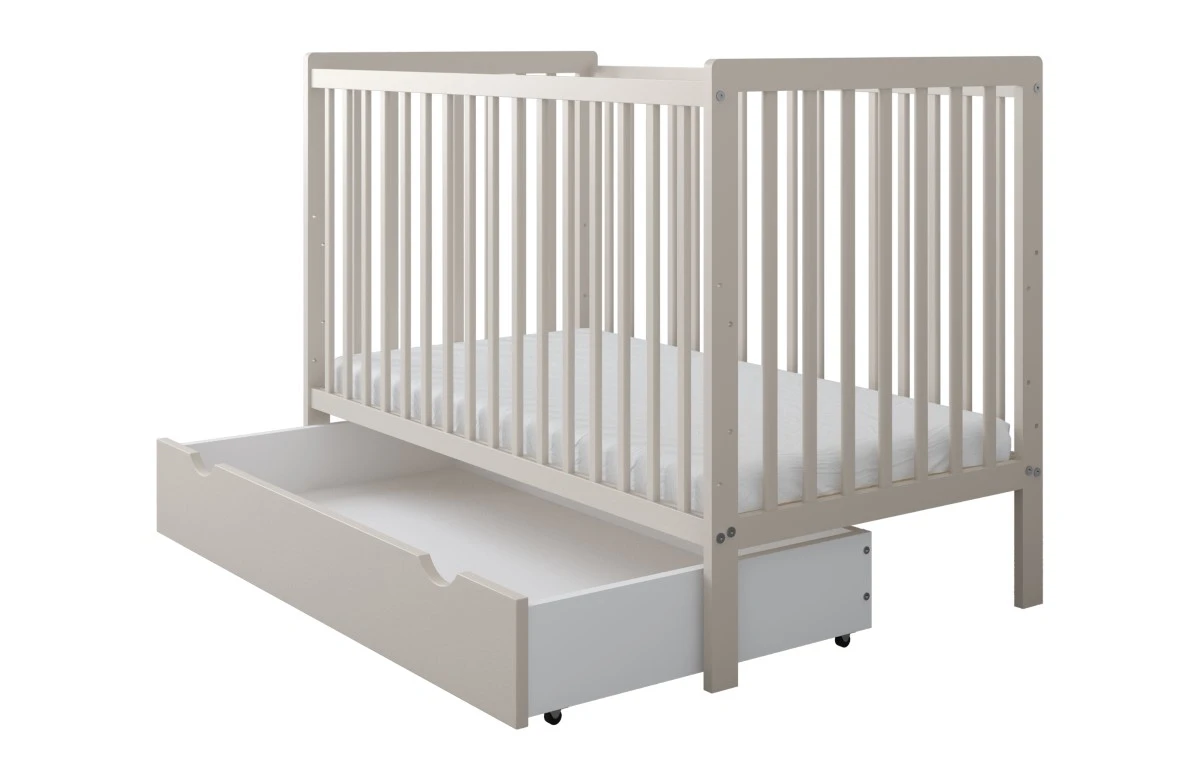 Dodatkowo istnieje możliwość dokupienia szuflady 120x60 na kółkach, która zapewni miejsce na pościel, kocyki i akcesoria, oraz dopasowanego materaca 120x60, jeśli chcesz skompletować cały zestaw od razu.