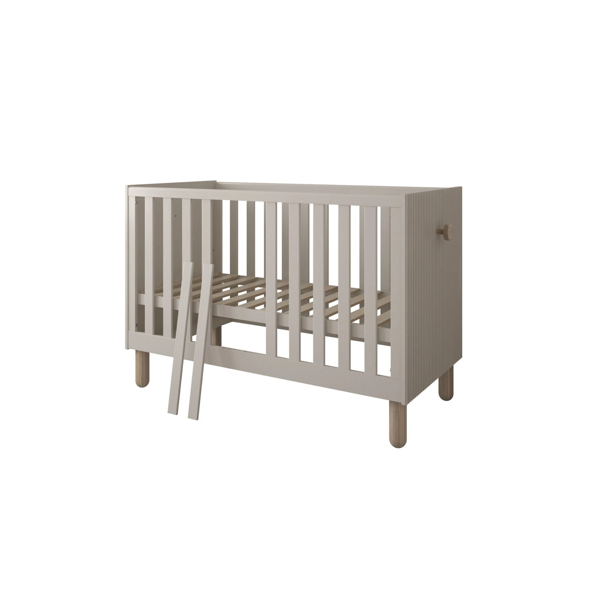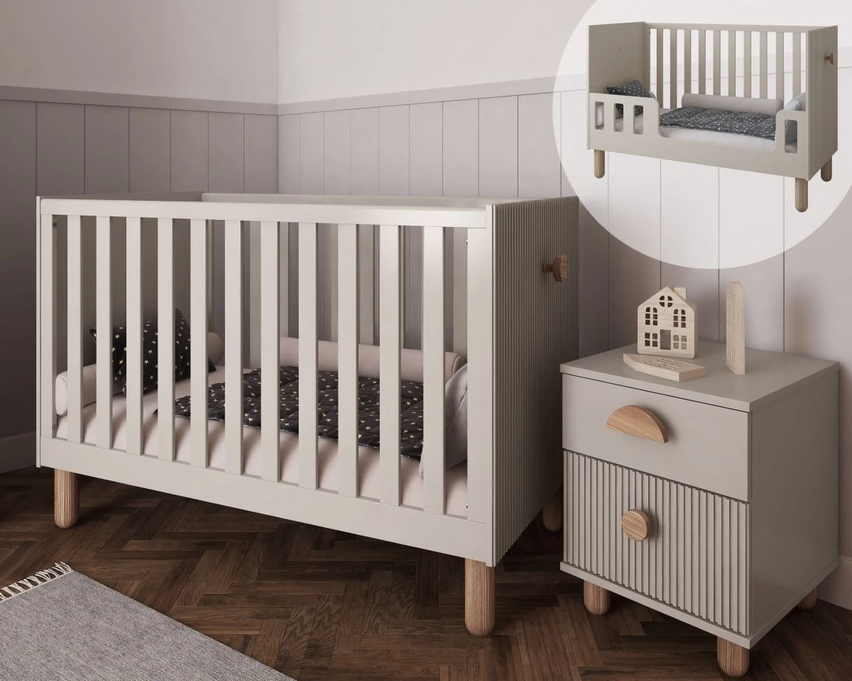 Stonowany kolor kaszmir wprowadza do wnętrza harmonię i poczucie bezpieczeństwa. Frezowane w stylu lameli szczyty łóżeczka i szerokie, płaskie szczebelki nadają mu nowoczesny charakter, a jednocześnie zapewniają dobrą widoczność dziecka podczas snu. To mebel, który wspiera równowagę emocjonalną i tworzy estetyczną, przyjazną przestrzeń do odpoczynku.