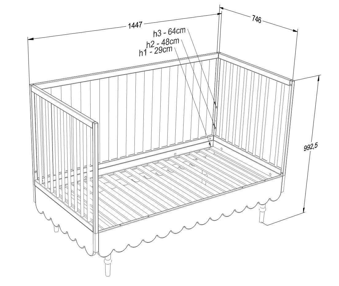 W pierwszym etapie pełni funkcję klasycznego łóżeczka niemowlęcego, a po demontażu jednego z boków – przekształca się w stylowy tapczanik dla starszego malucha.