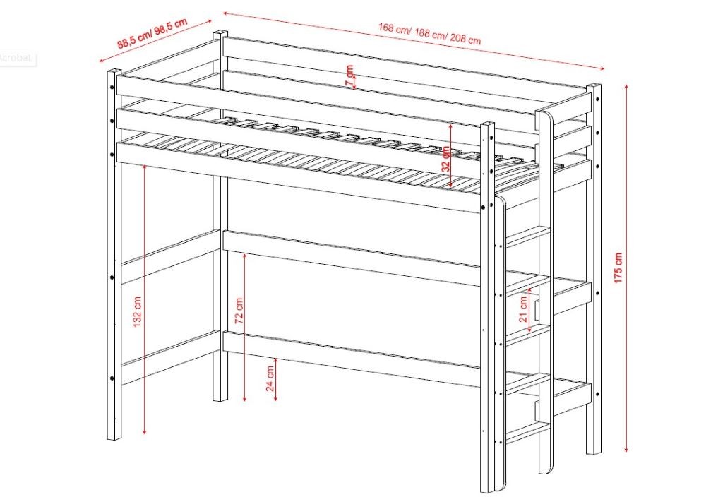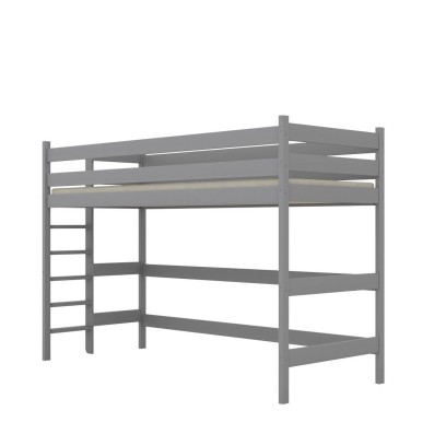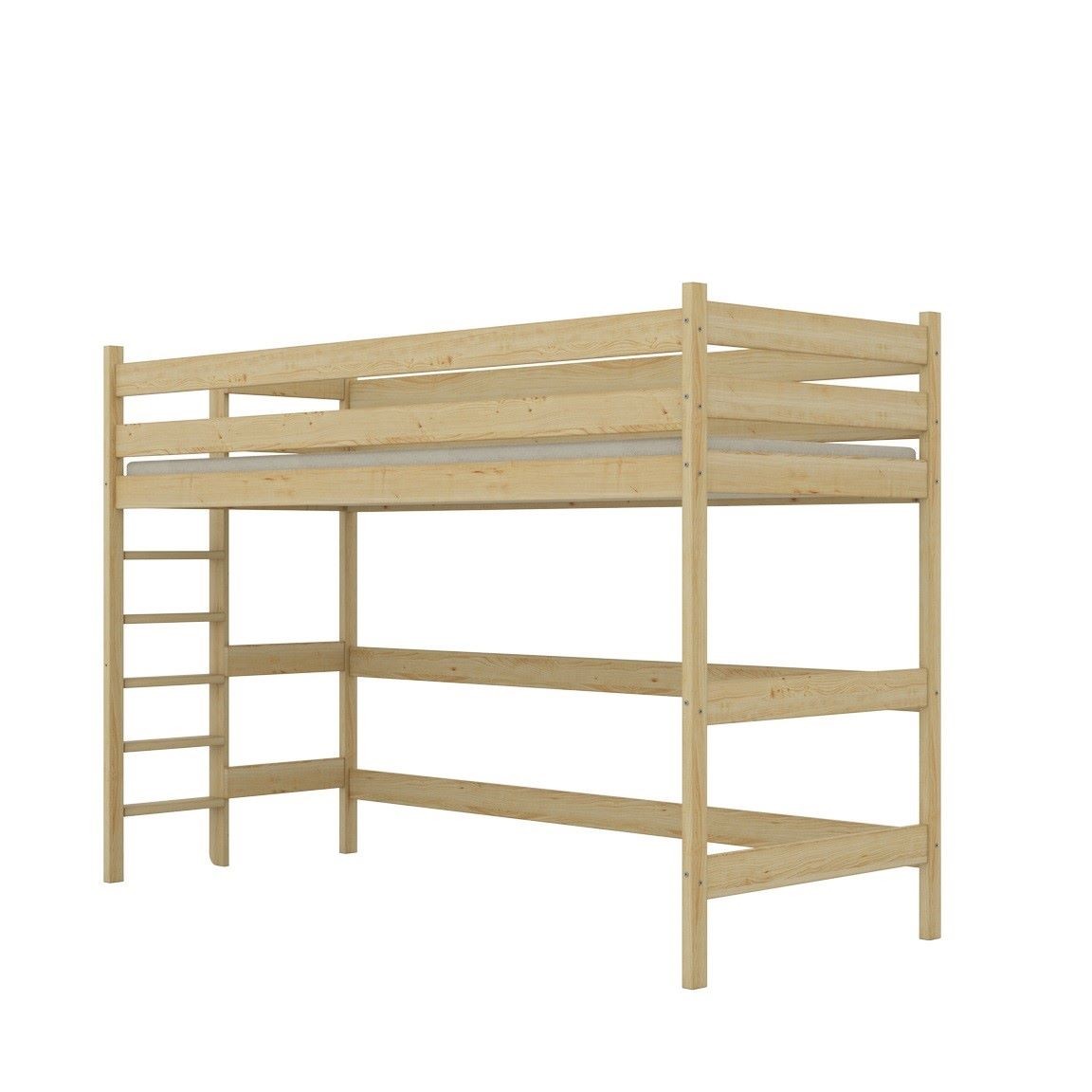 Konstrukcja łóżka wykonana jest z litego drewna sosnowego, które zapewnia stabilność i odporność na codzienne użytkowanie. Wysokie barierki ochronne gwarantują bezpieczeństwo snu, a drabinka montowana z boku pozwala łatwo dopasować mebel do układu pomieszczenia – idealne rozwiązanie, gdy łóżko stoi przy ścianie.
