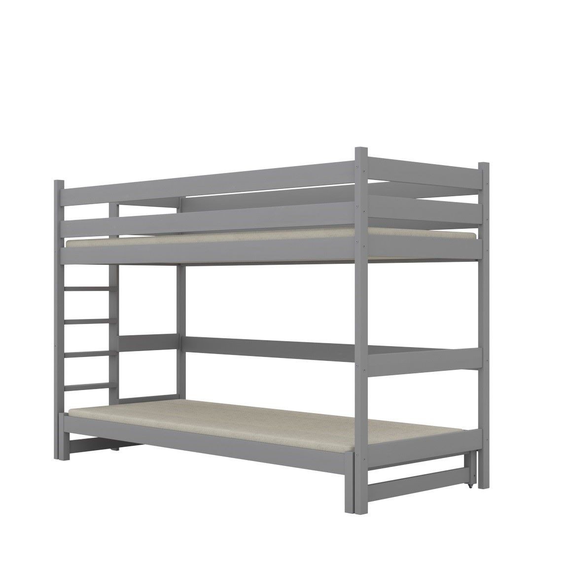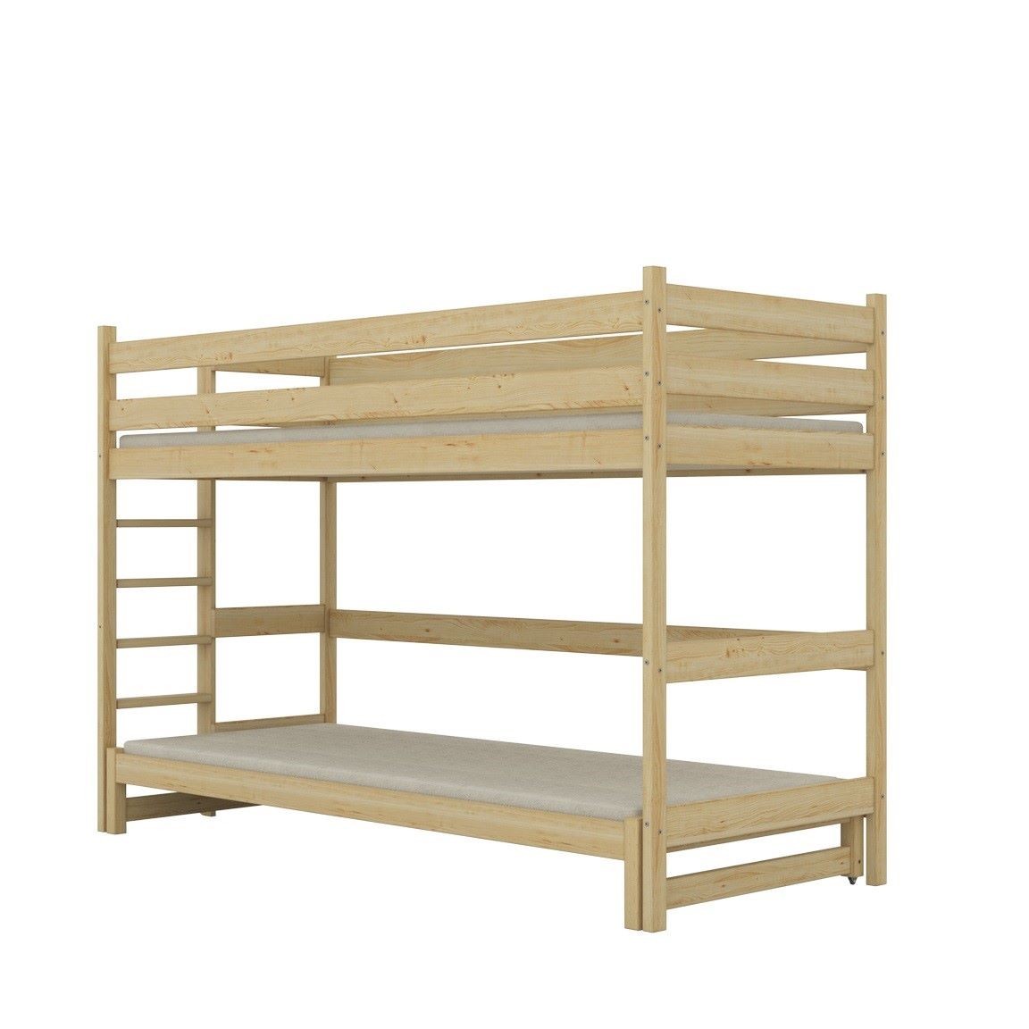 Obie konstrukcje wykonane są z litego drewna sosnowego, dzięki czemu całość pozostaje trwała, stabilna i bezpieczna. Wysokie barierki ochronne chronią dziecko podczas snu, a drabinka zamontowana z boku umożliwia wygodne wejście nawet w niewielkich pomieszczeniach. Każdy element mebla został dokładnie wykończony, co gwarantuje bezpieczeństwo codziennego użytkowania.