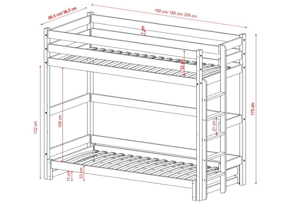 Model dostępny jest w pięciu rozmiarach – od 160×80 cm do 200×90 cm. Możesz dobrać materace dopasowane do każdego łóżka, a całość zmontować samodzielnie według dołączonej instrukcji. To praktyczne, elastyczne rozwiązanie, które rośnie razem z dzieckiem.