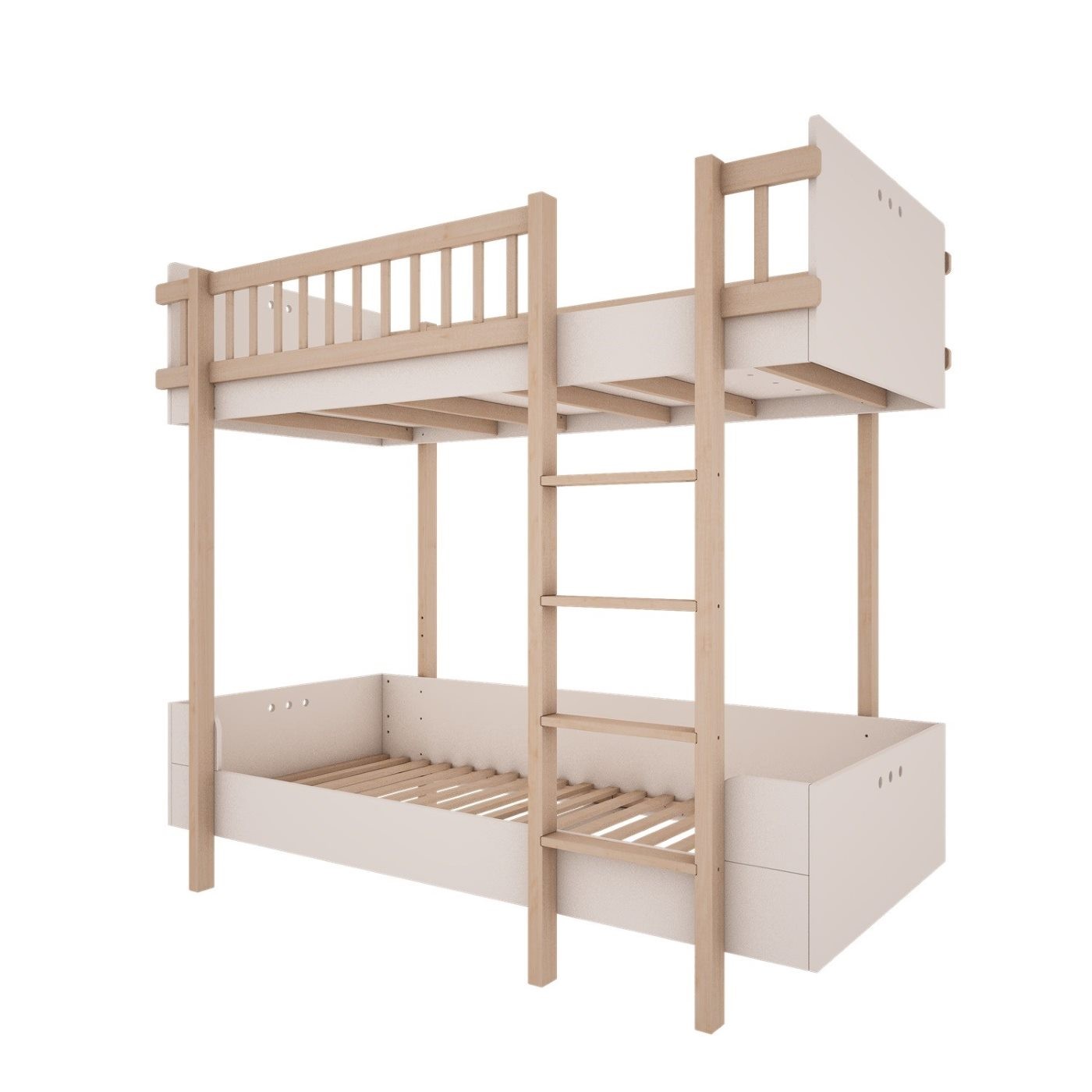 Łóżko piętrowe Basic białe to idealne rozwiązanie do pokoju rodzeństwa. Zapewnia dwa pełnowymiarowe miejsca do spania 90×200 cm, jednocześnie zajmując przestrzeń jednego łóżka. Połączenie bieli i naturalnego drewna bukowego nadaje wnętrzu lekkości i ciepła, a styl skandynawski sprawia, że łóżko doskonale pasuje do dziecięcych i młodzieżowych aranżacji.