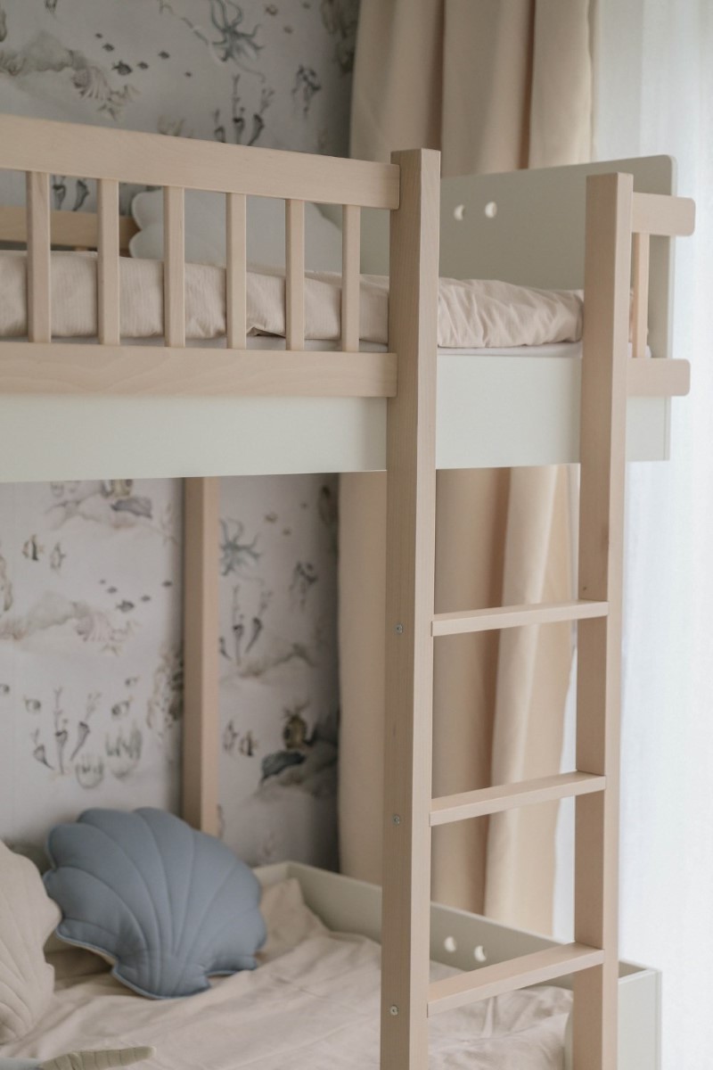 Do górnego łóżka prowadzi stabilna drabinka z litego drewna bukowego, a wysokie zabezpieczenia wokół posłania chronią dziecko podczas snu.