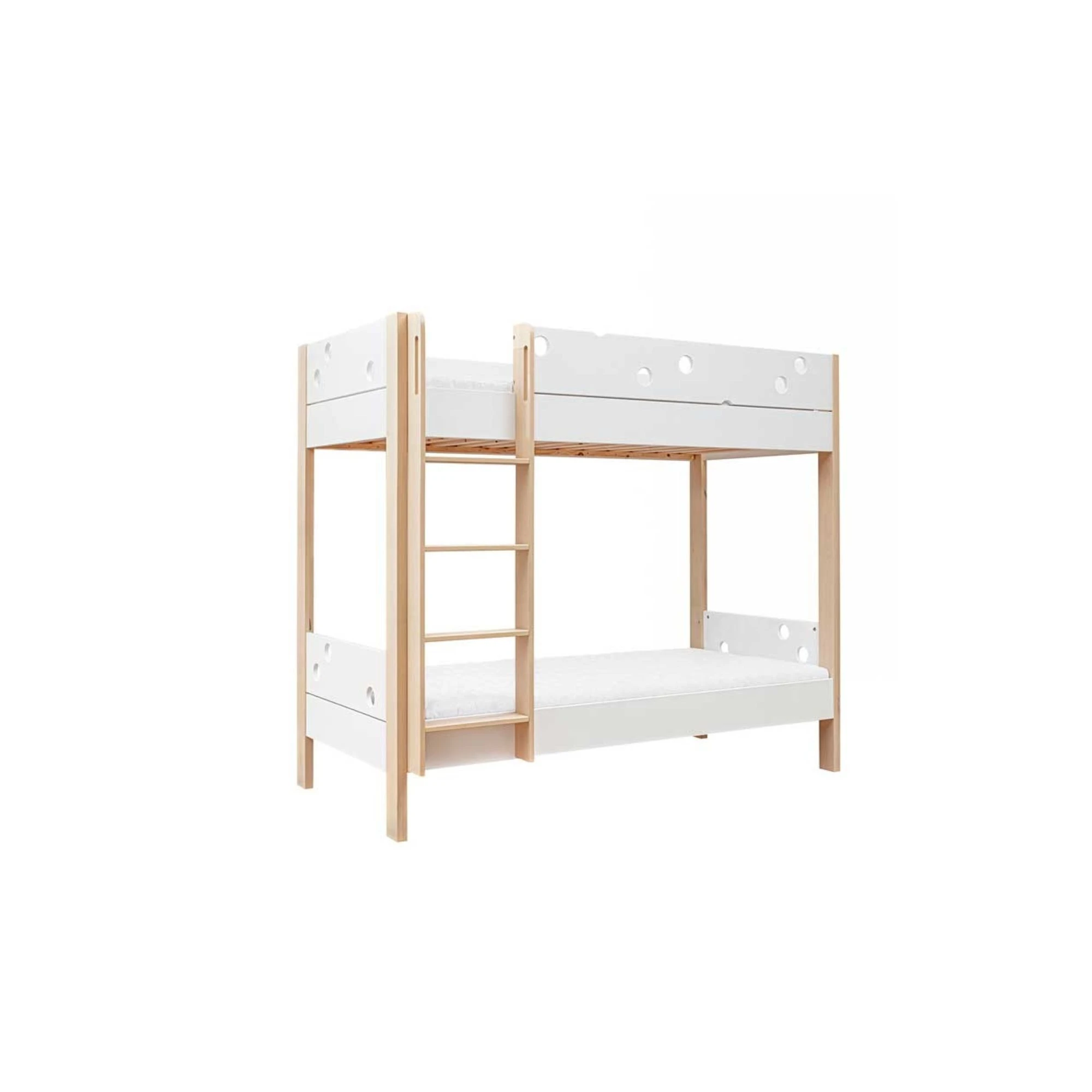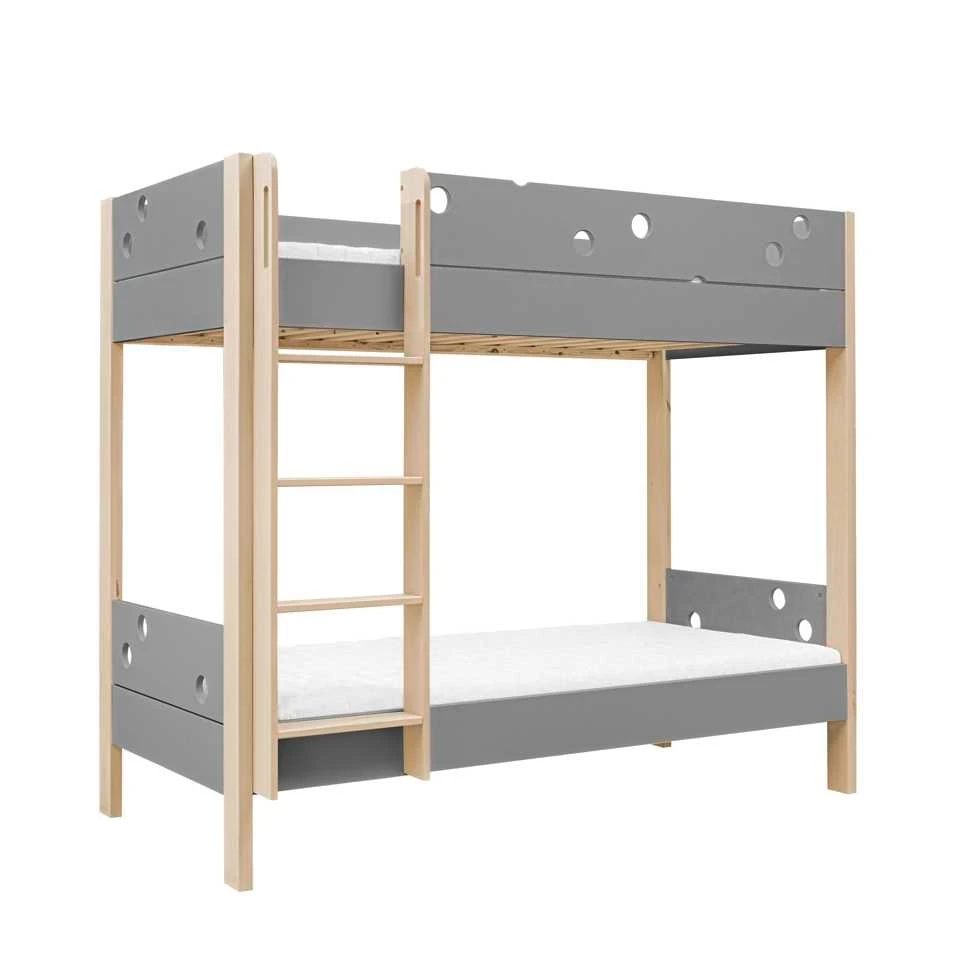 Łóżko piętrowe Funflex to nowoczesne łóżko piętrowe 90x200 z kolekcji Funflex, idealne do wspólnego pokoju młodzieżowego. Dwa poziomy spania w jednej bryle pozwalają zaoszczędzić miejsce, a połączenie litego drewna brzozowego z MDF lakierowanym na biało lub szaro oraz barierkami z okrągłymi otworami tworzy spójny zestaw z pozostałymi młodzieżowymi meblami Funflex.