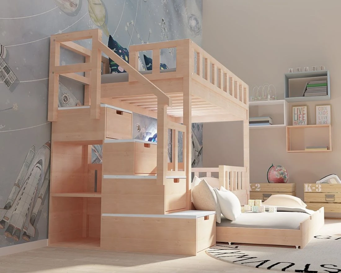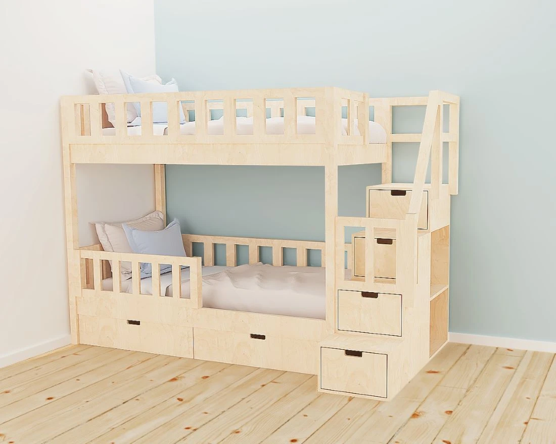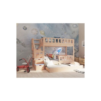 Łóżko wyposażone jest w stabilne schody z poręczą, które nie tylko zapewniają bezpieczne wejście na górne łóżko, ale też pełnią funkcję pojemnych schowków. W szufladkach można przechowywać książki, gry, ubrania czy akcesoria szkolne. Dodatkowo z boku schodów znajdują się półeczki, idealne na książki lub dekoracje.