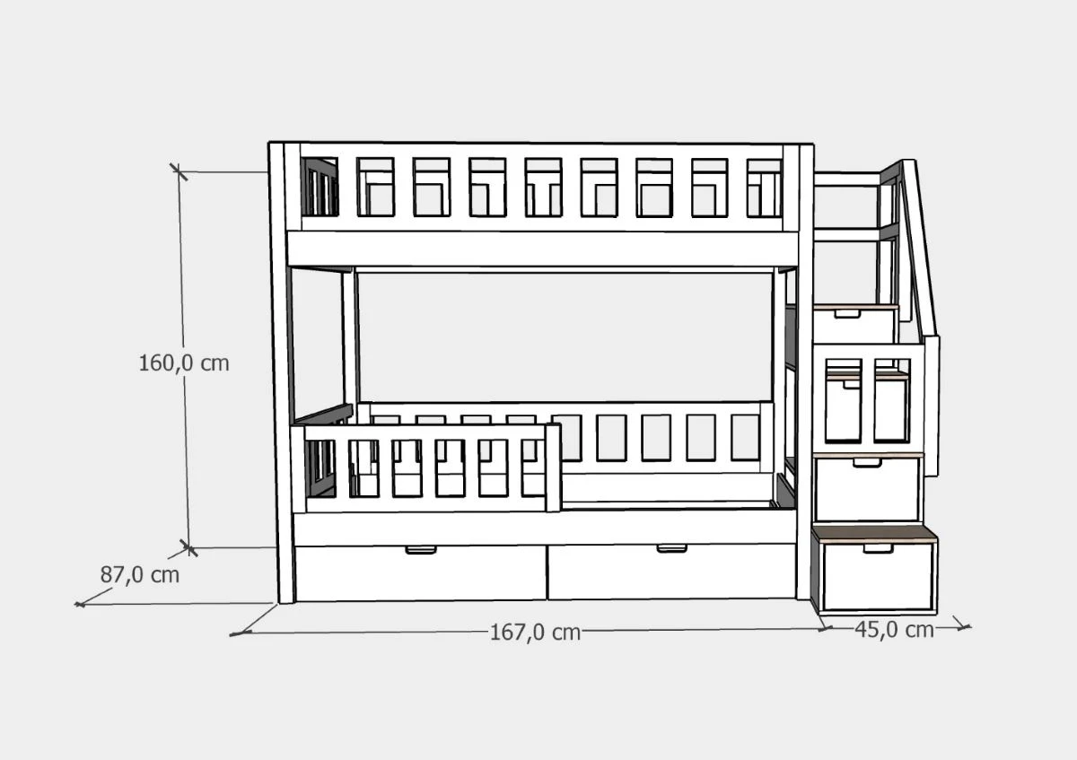 80x160 cm – długość 167 cm + 45 cm schodki, szerokość 87 cm, opcjonalny materac do szuflady 80x150 cm