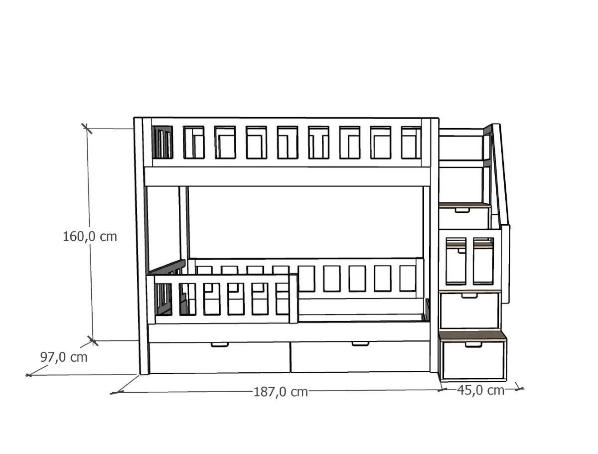 90x180 cm – długość 187 cm + 45 cm schodki, szerokość 97 cm, opcjonalny materac do szuflady 90x170 cm