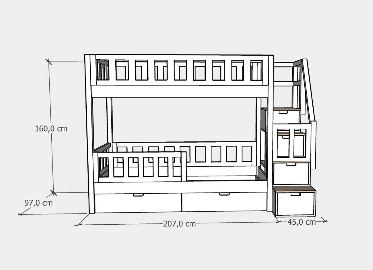 90x200 cm – długość 207 cm + 45 cm schodki, szerokość 97 cm, opcjonalny materac do szuflady 90x190 cm