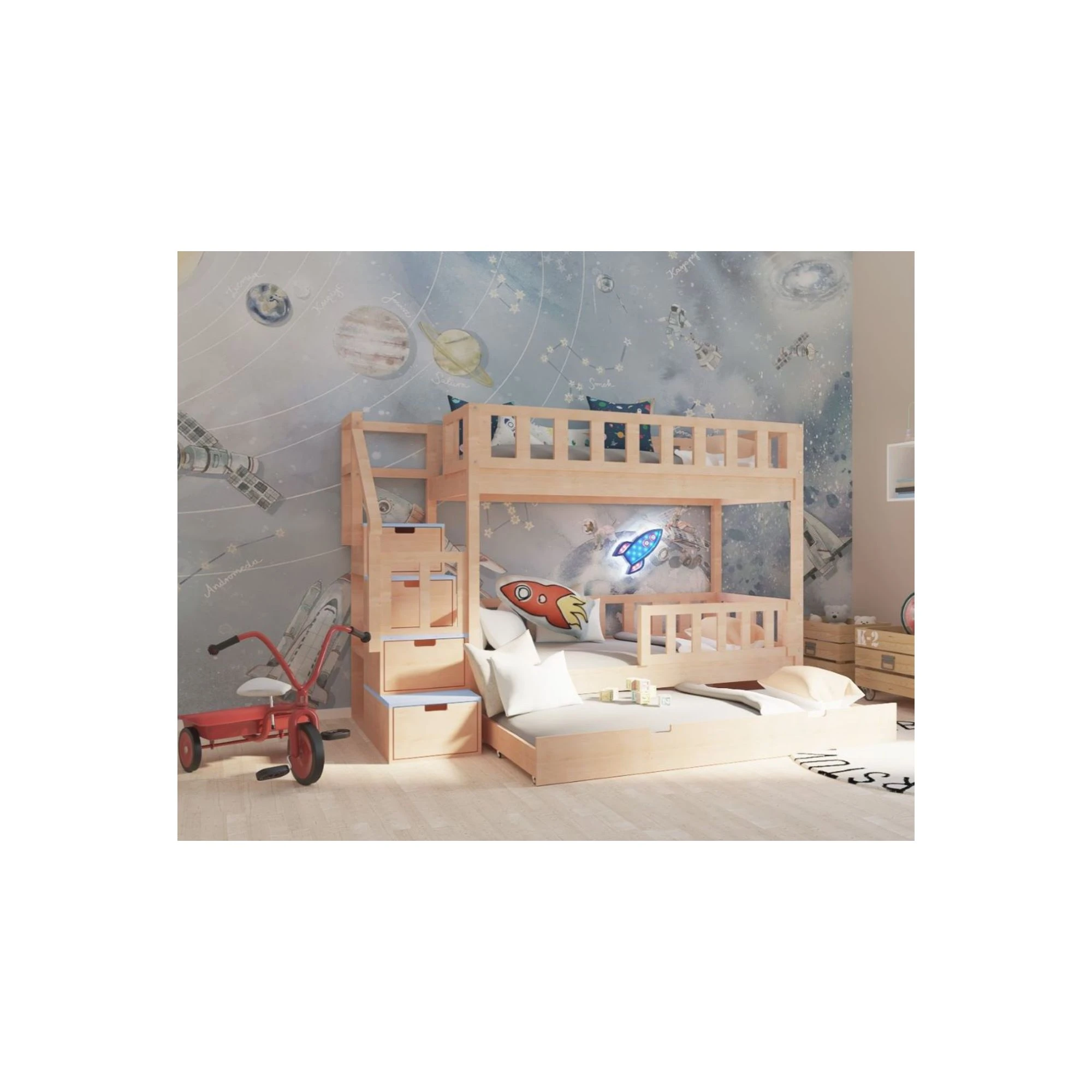 Pod dolnym łóżkiem znajduje się przestrzeń, którą można wykorzystać na dwie pojemne szuflady lub wybrać opcję z trzecim wysuwanym spaniem. To świetne rozwiązanie dla rodzeństwa lub wtedy, gdy w domu często nocują goście.
