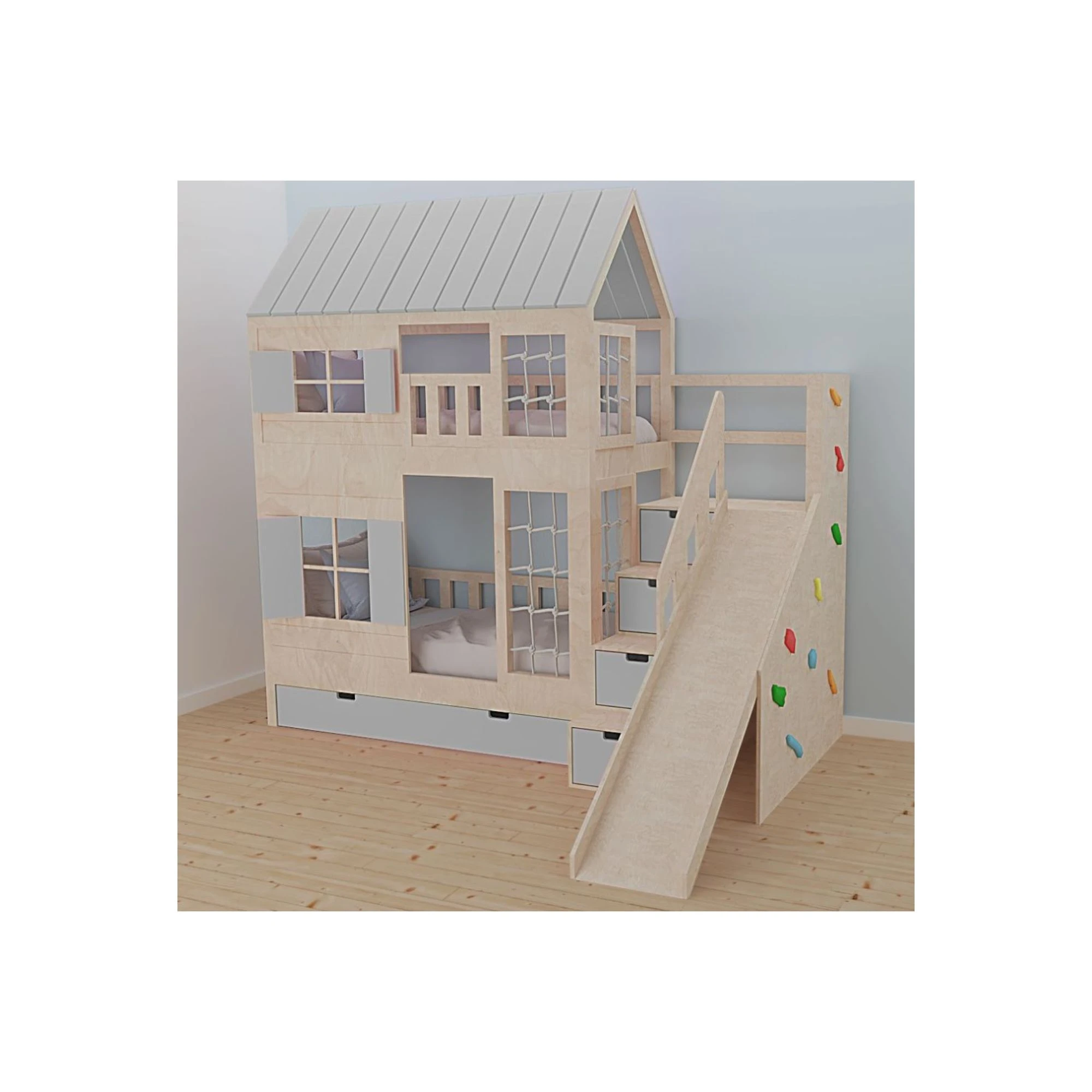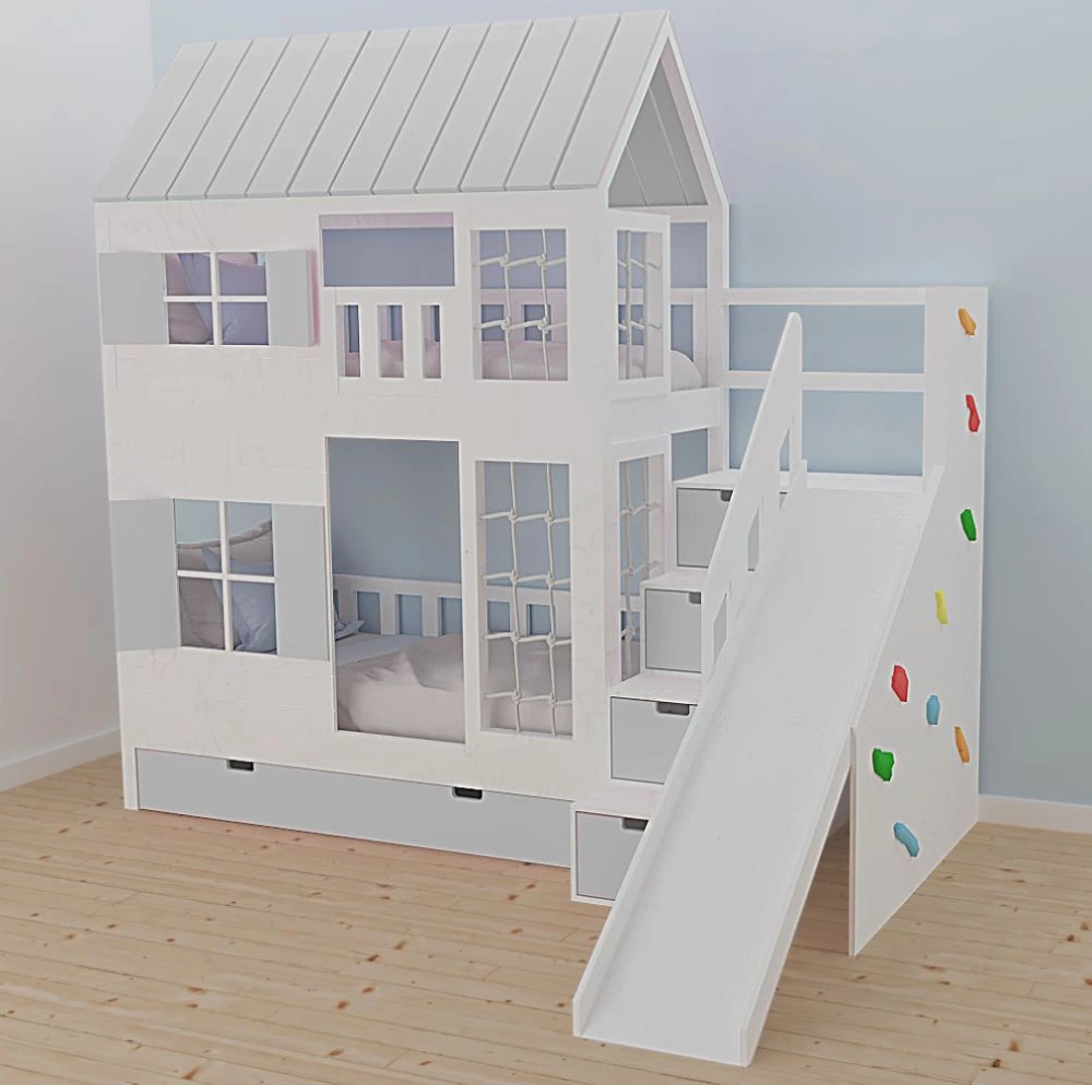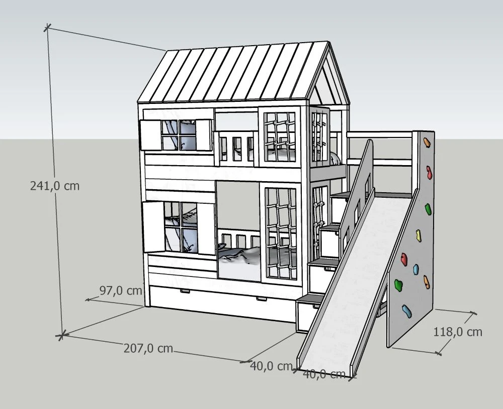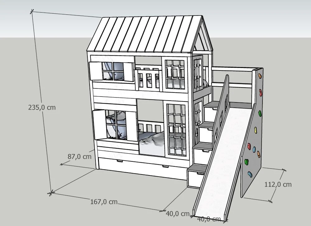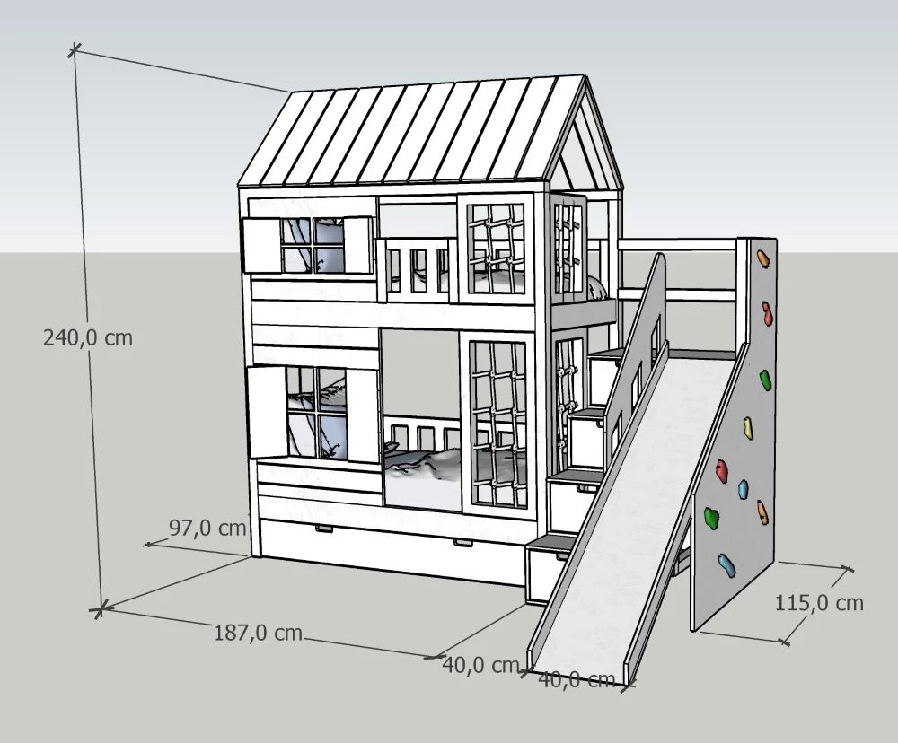 Na tym łóżku odpoczynek to dopiero początek. Dzieci mogą korzystać ze zjeżdżalni o szerokości 40 cm, która zamienia poranki w prawdziwą frajdę, a ścianka wspinaczkowa z kolorowymi uchwytami zachęca do aktywności i rozwija sprawność motoryczną. To domowy plac zabaw, w którym każda zabawa wspiera rozwój wyobraźni, koordynacji i pewności siebie.