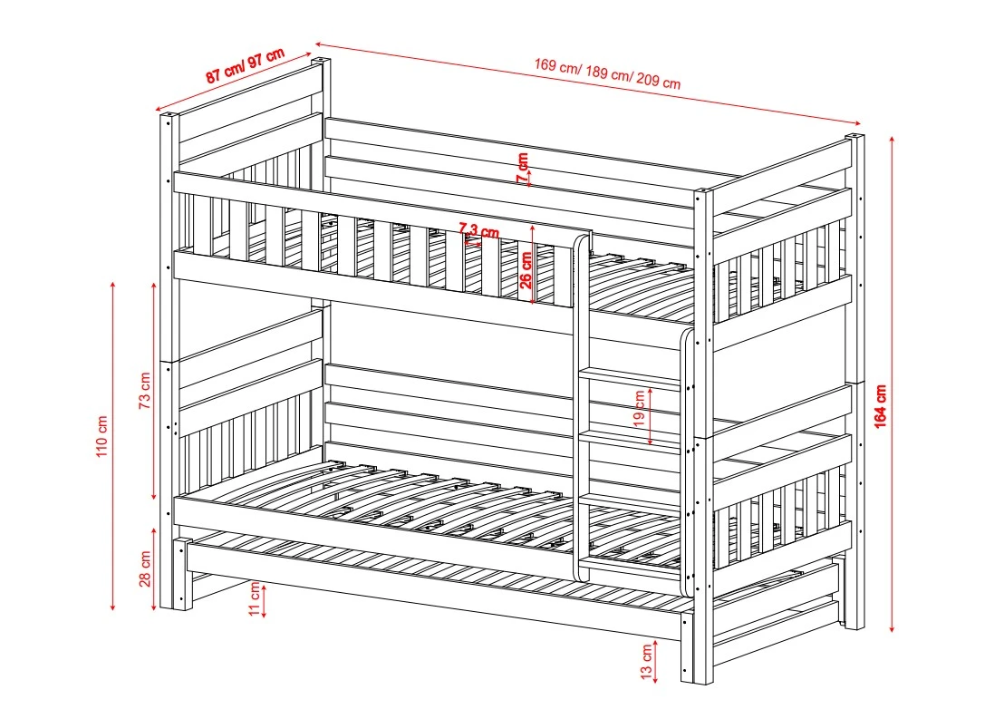 Wymiary łóżka piętrowego Lumo z dodatkowym spaniem