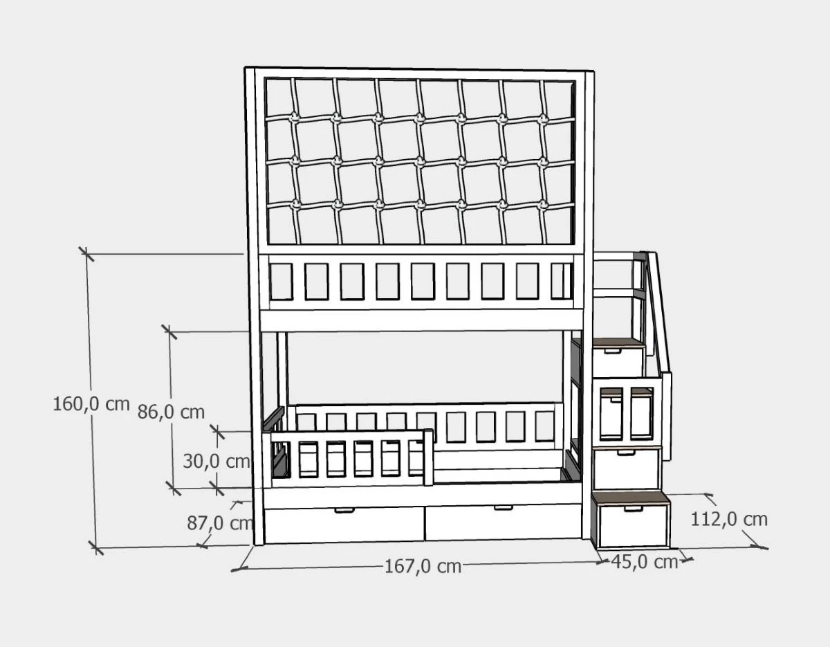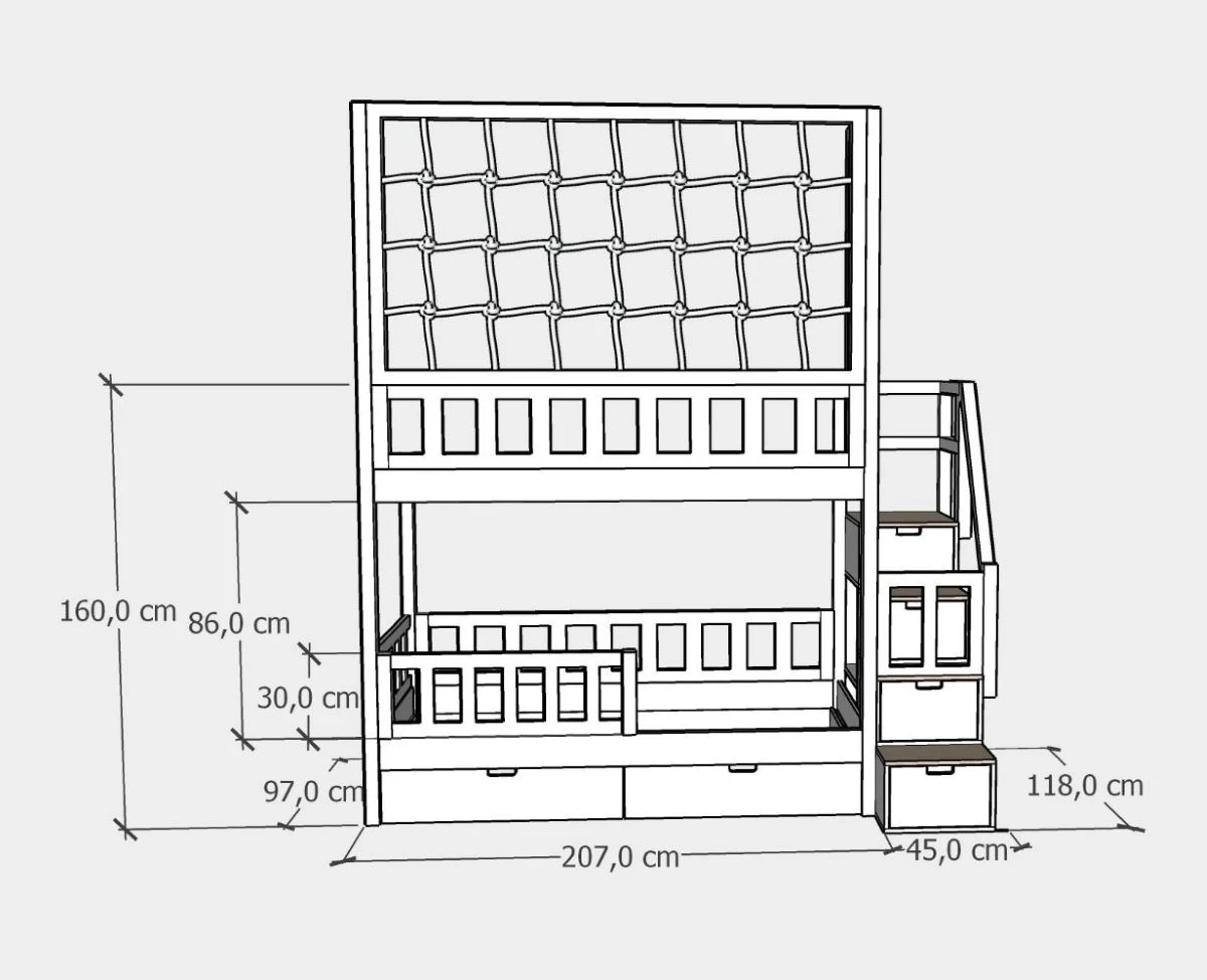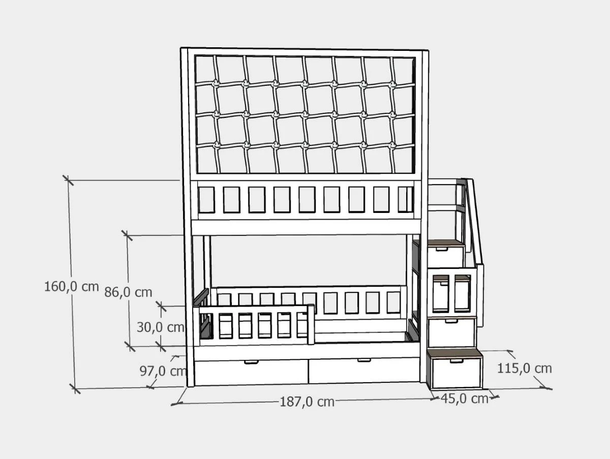 Integralną częścią konstrukcji jest panel sznurkowy, który pełni rolę ochronnej barierki i jednocześnie nadaje łóżku przytulny charakter. Wysokość panelu można podać w polu zamówienia, co pozwala idealnie dopasować mebel do wysokości pomieszczenia. Standardowa wysokość łóżka to 160 cm do panelu, ale dzięki tej możliwości łóżko piętrowe może być dopasowane zarówno do niskich, jak i wyższych pokoi. Sznurek wykonany jest z miękkiej i wytrzymałej bawełny, a oczka mają wymiary 20x20 cm. Kolor panelu można wybrać w standardzie biały lub za dopłatą: bordowy, czarny, musztardowy czy niebieski. Bezpieczeństwo zwiększają również barierki o wysokości 30 cm z możliwością podwyższenia do 40 cm oraz solidne stelaże o nośności do 120 kg, które można dodatkowo wzmocnić do 200 kg.