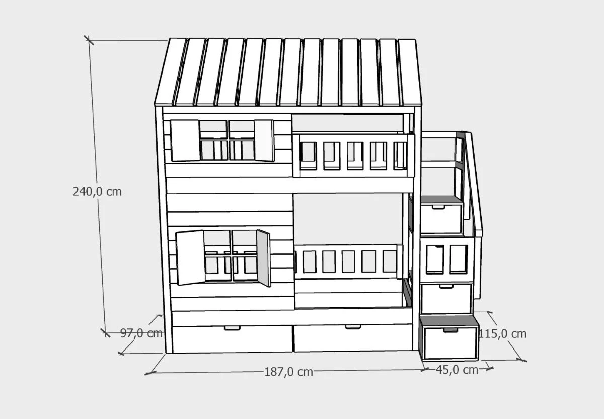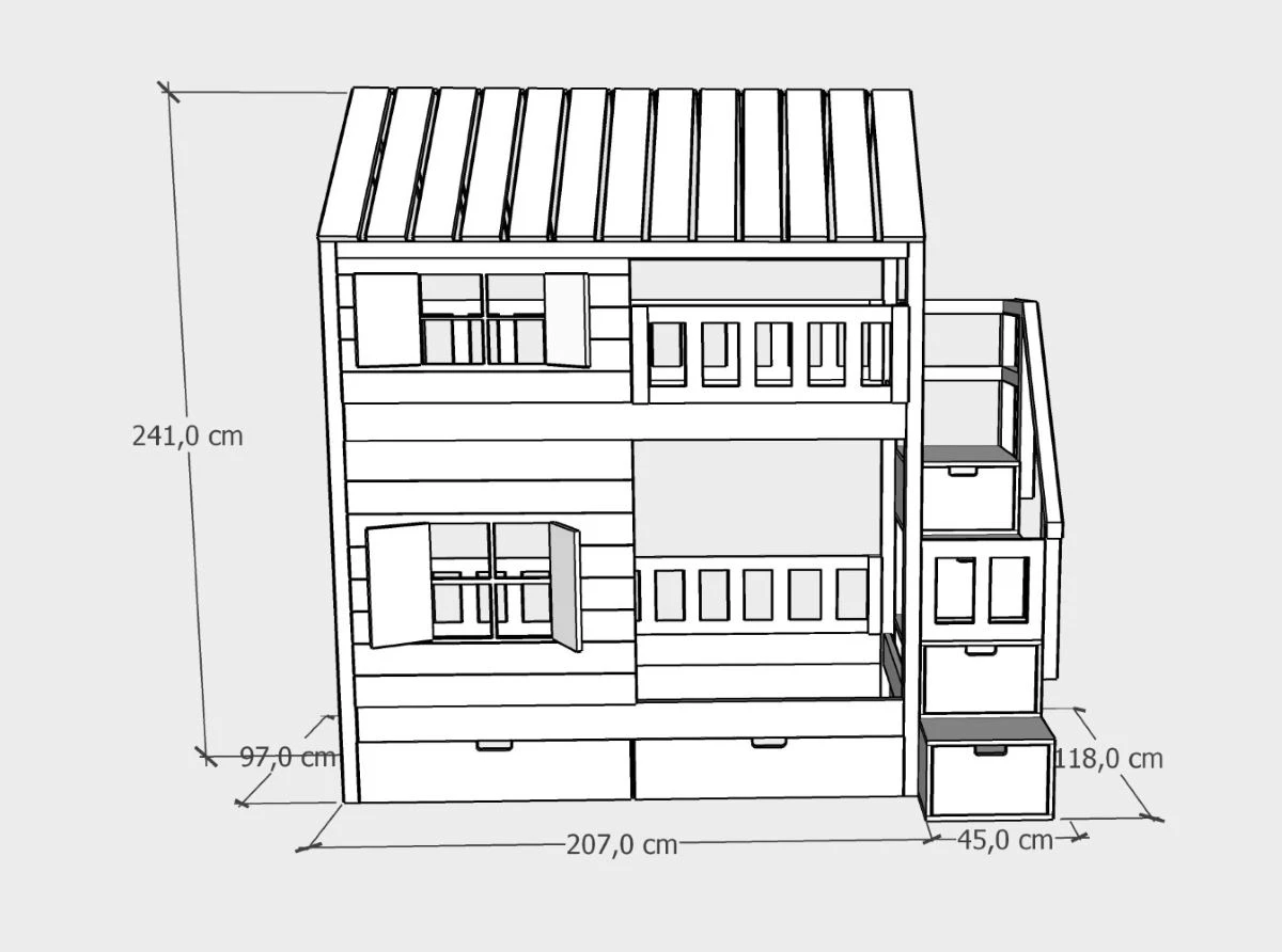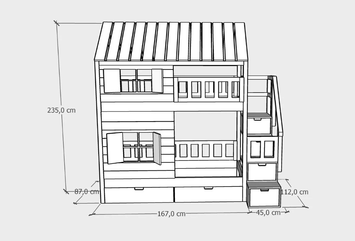 Łóżko piętrowe ze schodami w kształcie domku z pełnym dwuspadowym daszkiem, uroczymi okiennicami i dekoracyjnymi doniczkami to mebel, który łączy w sobie funkcjonalność i magię dziecięcej wyobraźni. To idealny wybór do pokoju dziewczynki i do pokoju chłopca, ponieważ dzięki możliwości personalizacji kolorów można dopasować je zarówno do pastelowych, jak i bardziej energetycznych aranżacji. Poznaj również inne modele łóżek piętrowych i wybierz to wymarzone do pokoju dziecka.