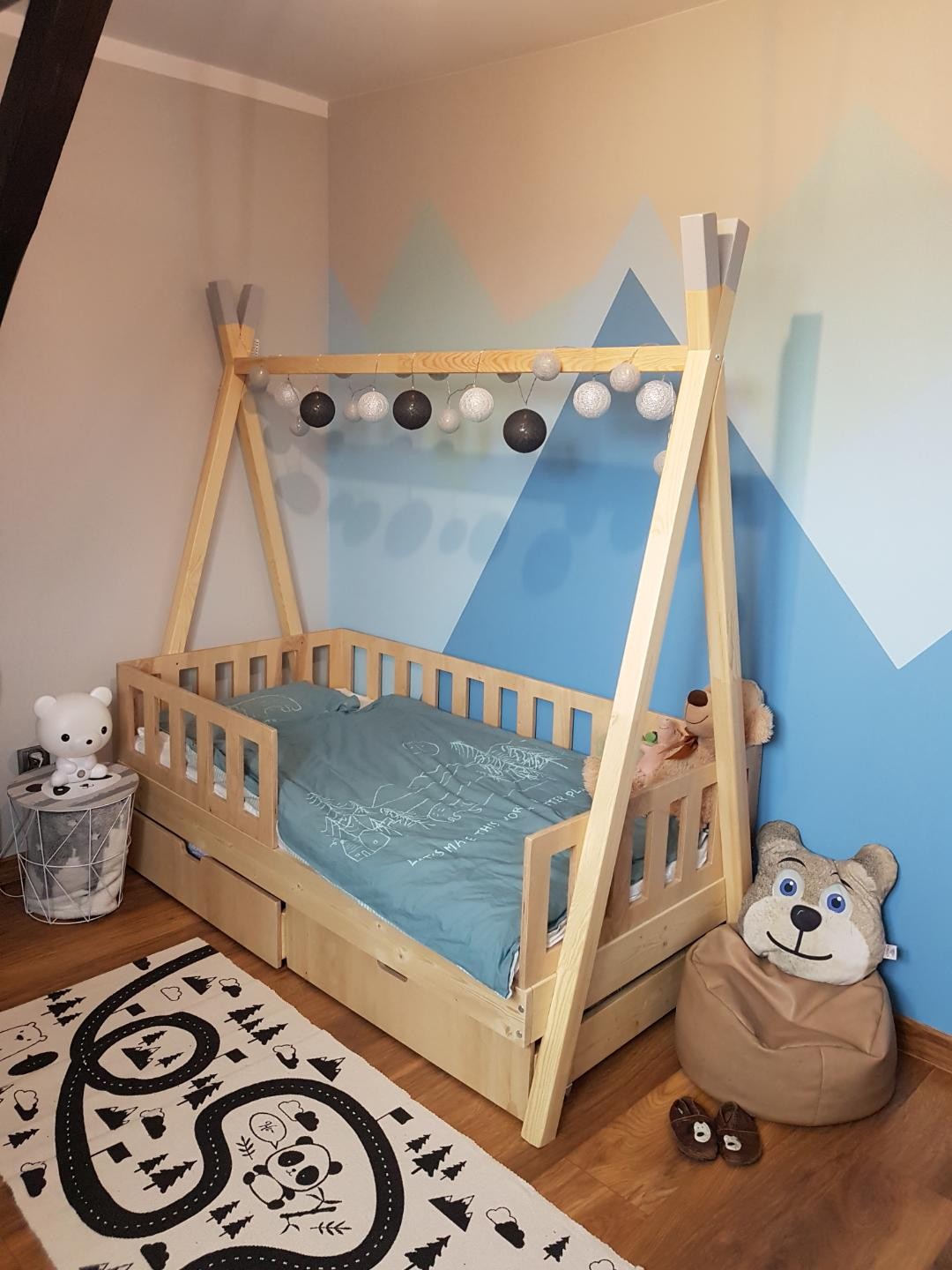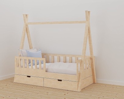 Łóżko tipi z szufladami wykonane z drewna sosnowego i sklejki liściastej, pomalowane certyfikowanymi i bezpiecznymi dla dzieci lakierami i farbami wodnymi. Łóżko w kolorze naturalnym dostępne jest w trzech rozmiarach. Łóżko nie posiada materaca.