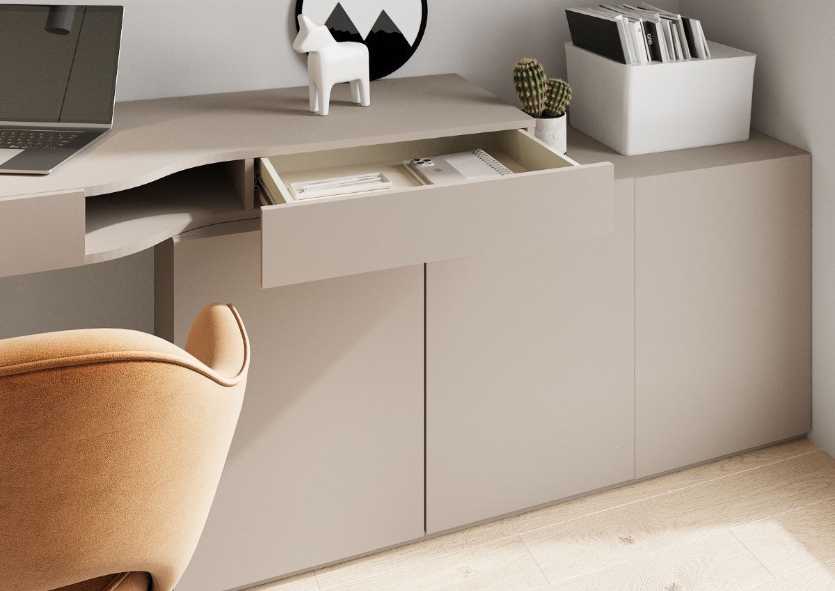 Biurko z szufladą i wnęką po prawej stronie tworzy ergonomiczne stanowisko pracy. Szeroki blat pomieści laptopa, lampkę, książki i przybory, a przy tym nie przytłacza przestrzeni.