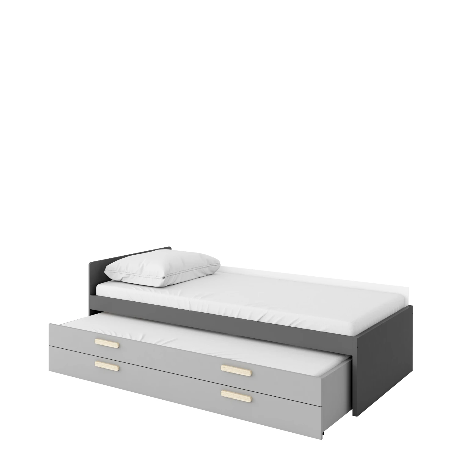 Prosta bryła i grafitowa kolorystyka sprawiają, że mebel wpasuje się w nowoczesne i klasyczne wnętrza. To łóżko, które równie dobrze wygląda w pokoju chłopca, jak i dziewczynki.