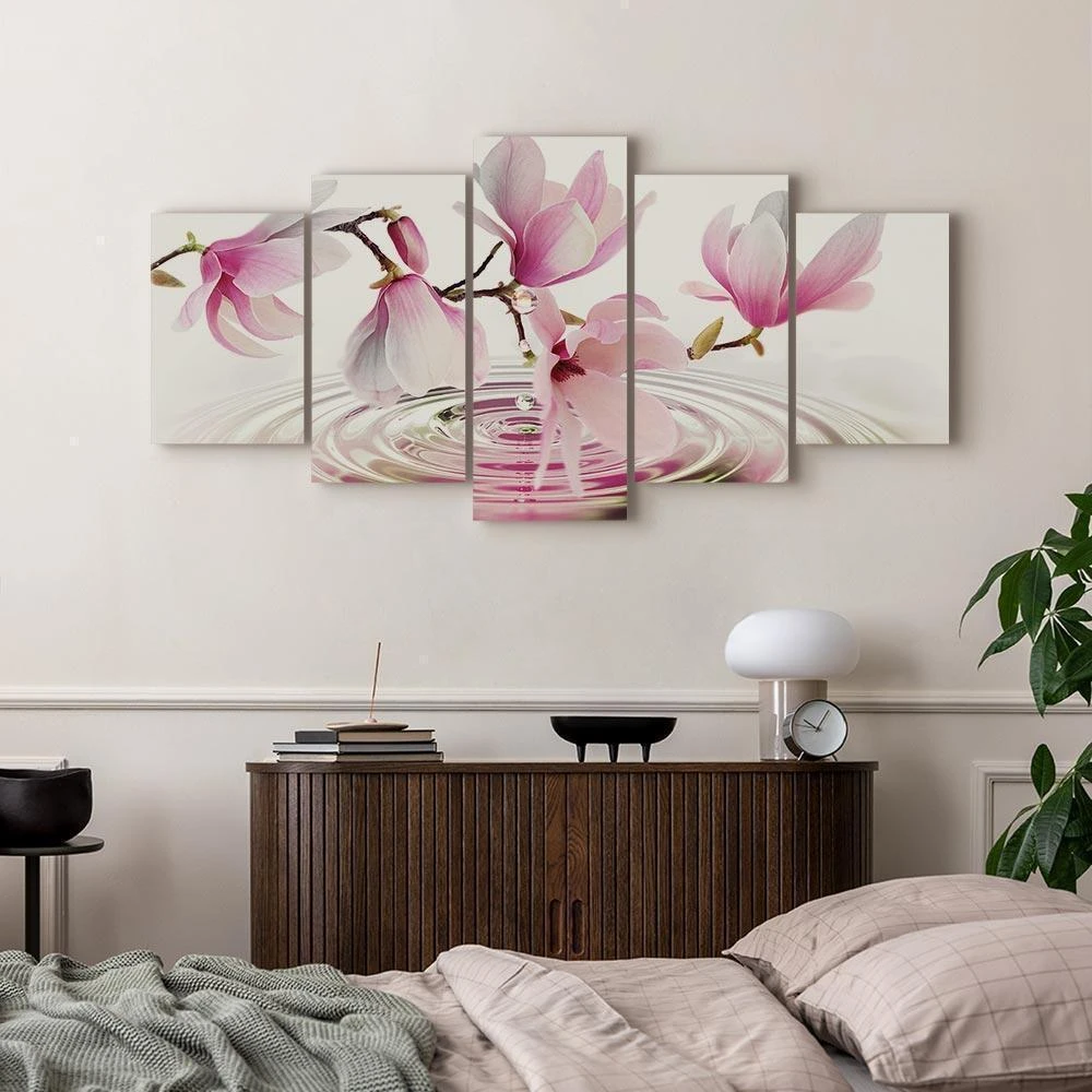 Niepowtarzalne obrazy z estetycznymi motywami są idealnym dopełnieniem eleganckiej aranżacji. Przy odrobinie kreatywności można je z łatwością dopasować do wnętrza urządzonego w każdym stylu. Obraz na płótnie "Obraz - Magnolie nad wodą (5-częściowy) szeroki różowy" to unikalny element dekoracyjny który jest niemal uniwersalny. Przypadnie do gustu każdemu, kto poszukuje oryginalnych ozdób, aby dopełnić swoją aranżację. Umieść go w swoim wnętrzu, a przekonasz się, że jest już kompletne i nie potrzebujesz już innych dodatków. Nie musisz się obawiać o jakość i wygląd swojej dekoracji. Dostępne w ofercie obrazy na płótnie wiernie odwzorowują detale. Odpowiednio dostosowana rozdzielczość druku gwarantuje intensywność kolorów oraz ostrość prezentowanego motywu. Tego typu produkty to doskonałe rozwiązanie, jeśli wciąż narzekasz na puste miejsce na ścianie i zastanawiasz się, jak je wypełnić. To stylowy element dekoracyjny, dzięki któremu wnętrze staje się wyjątkowo przytulne.