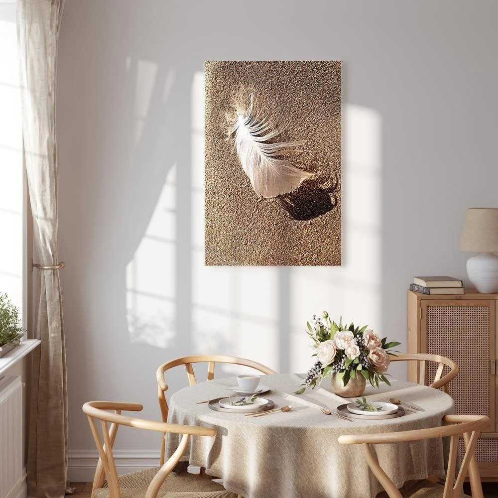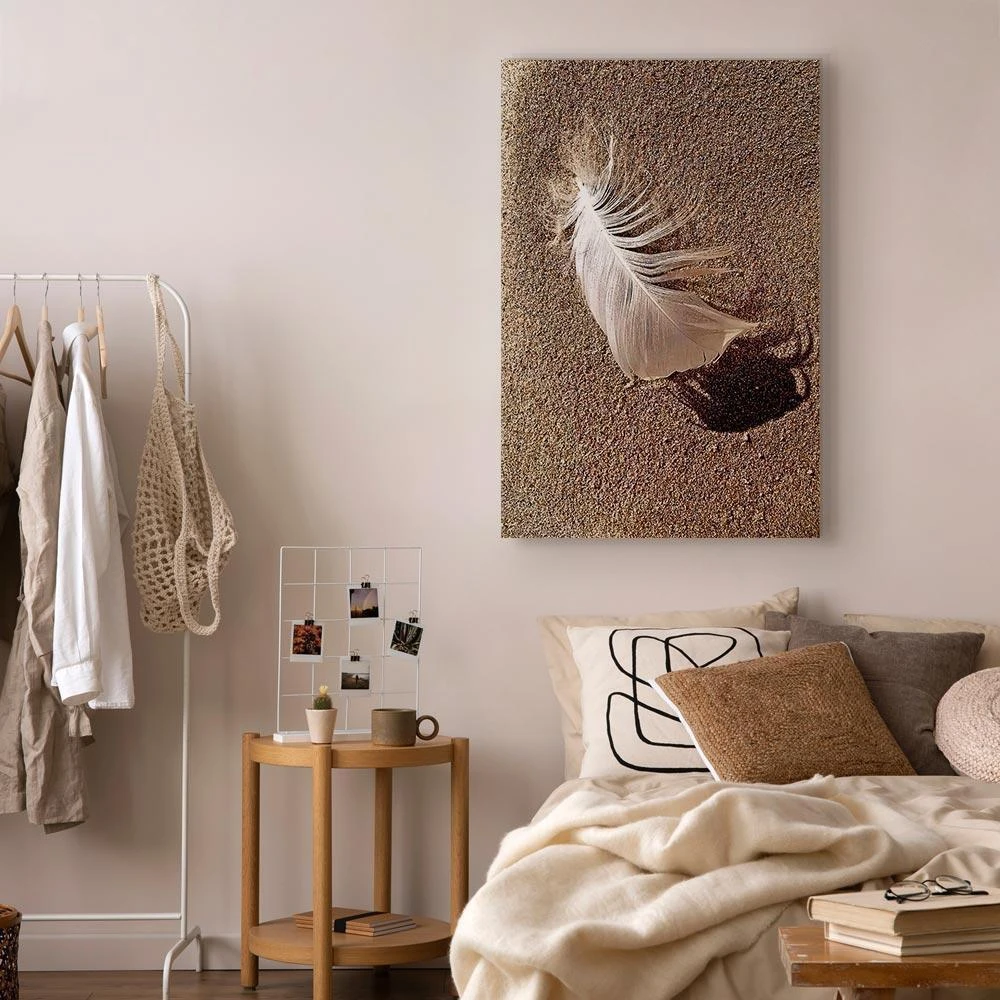 Niepowtarzalne obrazy z estetycznymi motywami są idealnym dopełnieniem eleganckiej aranżacji. Przy odrobinie kreatywności można je z łatwością dopasować do wnętrza urządzonego w każdym stylu. Obraz na płótnie "Obraz - Pióro na piasku (1-częściowy) pionowy" to unikalny element dekoracyjny który jest niemal uniwersalny. Przypadnie do gustu każdemu, kto poszukuje oryginalnych ozdób, aby dopełnić swoją aranżację. Umieść go w swoim wnętrzu, a przekonasz się, że jest już kompletne i nie potrzebujesz już innych dodatków. Nie musisz się obawiać o jakość i wygląd swojej dekoracji. Dostępne w ofercie obrazy na płótnie wiernie odwzorowują detale. Odpowiednio dostosowana rozdzielczość druku gwarantuje intensywność kolorów oraz ostrość prezentowanego motywu. Tego typu produkty to doskonałe rozwiązanie, jeśli wciąż narzekasz na puste miejsce na ścianie i zastanawiasz się, jak je wypełnić. To stylowy element dekoracyjny, dzięki któremu wnętrze staje się wyjątkowo przytulne.