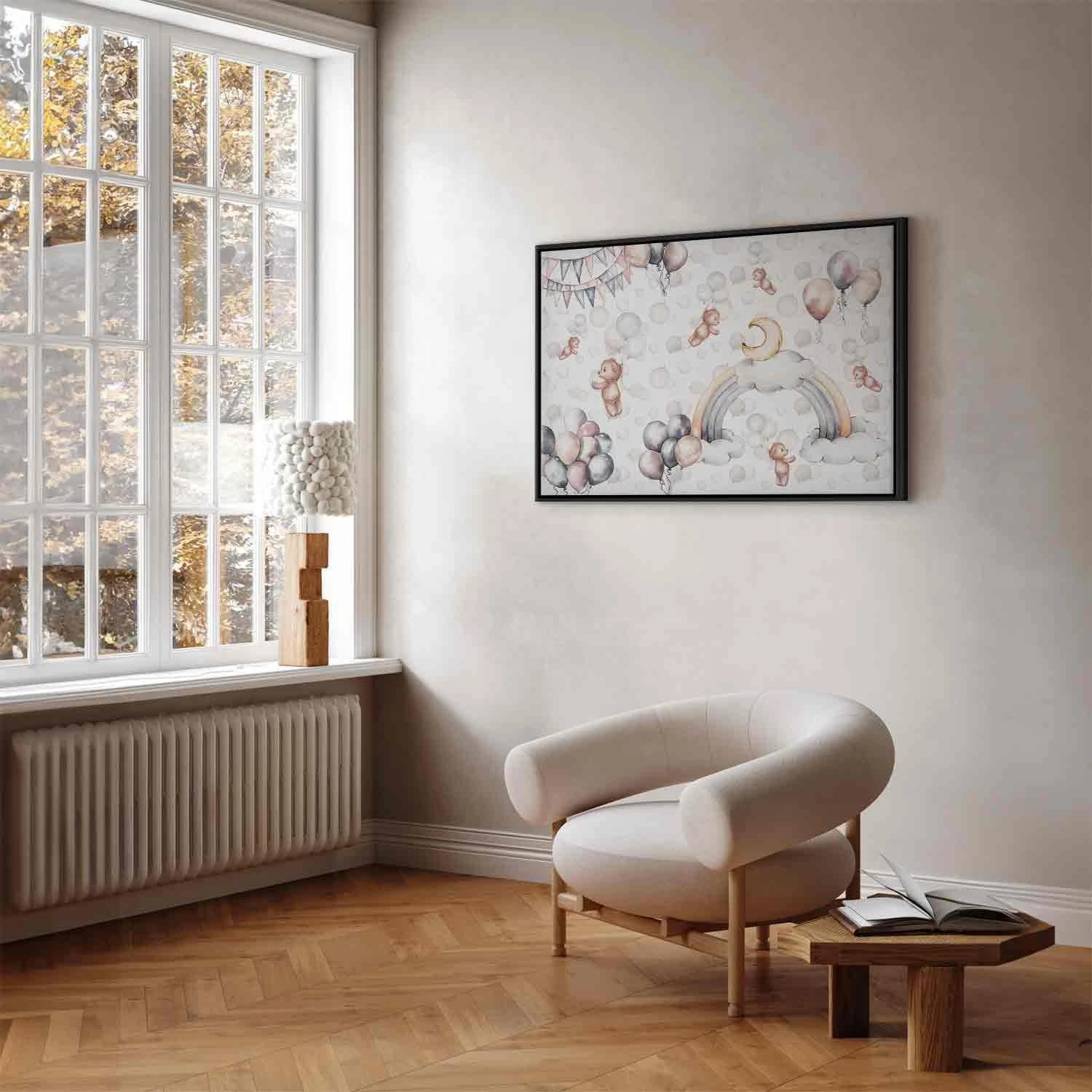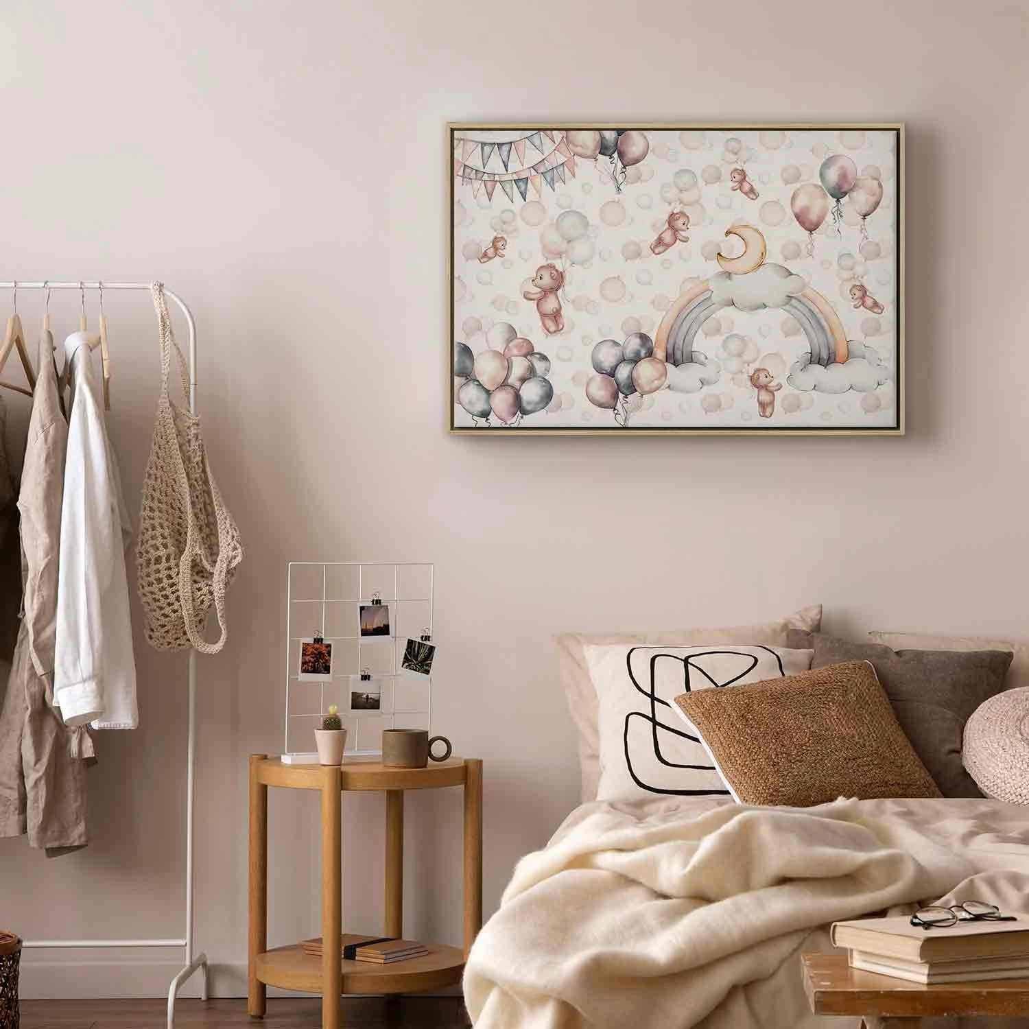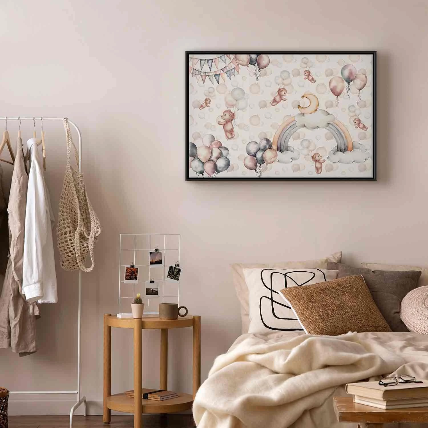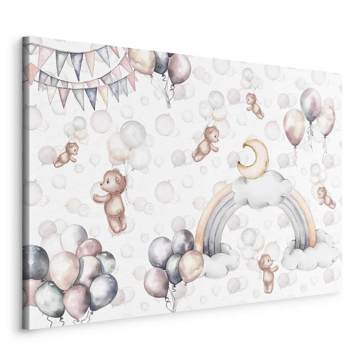 Niepowtarzalne obrazy z estetycznymi motywami są idealnym dopełnieniem eleganckiej aranżacji. Przy odrobinie kreatywności można je z łatwością dopasować do wnętrza urządzonego w każdym stylu. Obraz na płótnie "Obraz - Zabawkowe misie z balonikami - Latające pluszowe misie pośród balonów chmur i tęczy w subtelnej pastelowej kolorystyce" to unikalny element dekoracyjny który jest niemal uniwersalny. Przypadnie do gustu każdemu, kto poszukuje oryginalnych ozdób, aby dopełnić swoją aranżację. Umieść go w swoim wnętrzu, a przekonasz się, że jest już kompletne i nie potrzebujesz już innych dodatków. Nie musisz się obawiać o jakość i wygląd swojej dekoracji. Dostępne w ofercie obrazy na płótnie wiernie odwzorowują detale. Odpowiednio dostosowana rozdzielczość druku gwarantuje intensywność kolorów oraz ostrość prezentowanego motywu. Tego typu produkty to doskonałe rozwiązanie, jeśli wciąż narzekasz na puste miejsce na ścianie i zastanawiasz się, jak je wypełnić. To stylowy element dekoracyjny, dzięki któremu wnętrze staje się wyjątkowo przytulne.