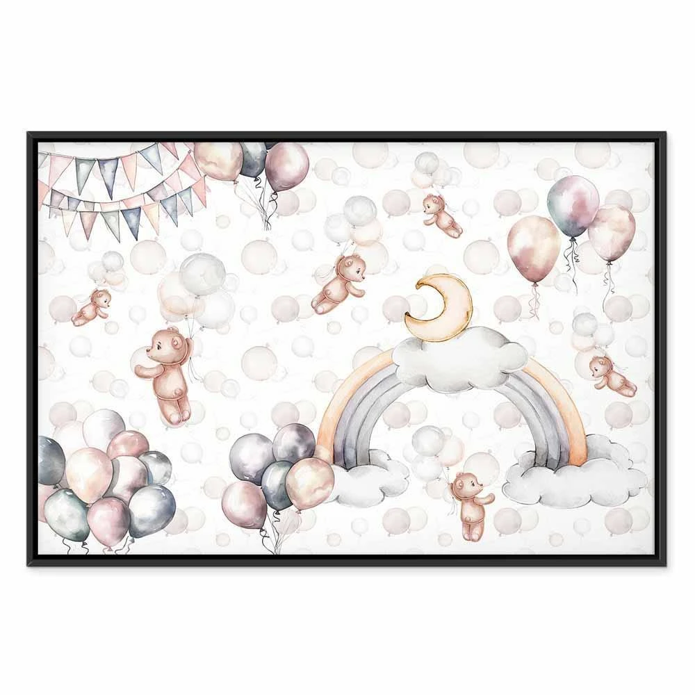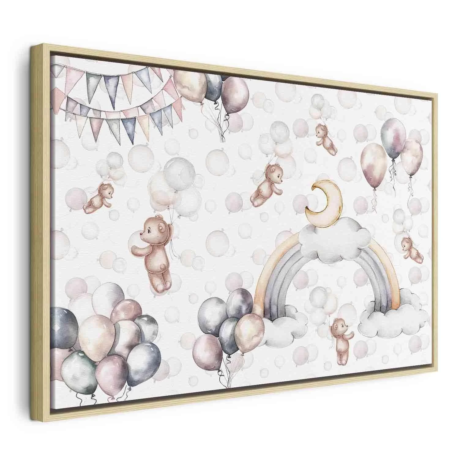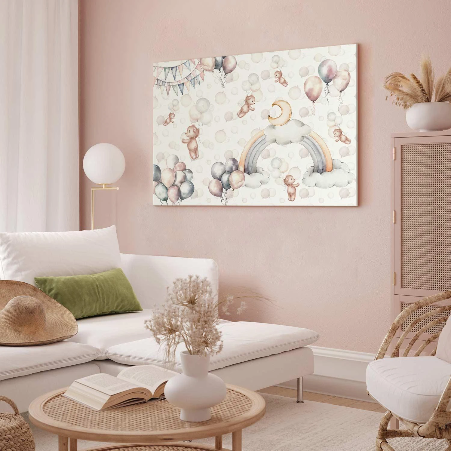 Obraz - Zabawkowe misie z balonikami - Latające pluszowe misie pośród balonów chmur i tęczy w subtelnej pastelowej kolorystyce