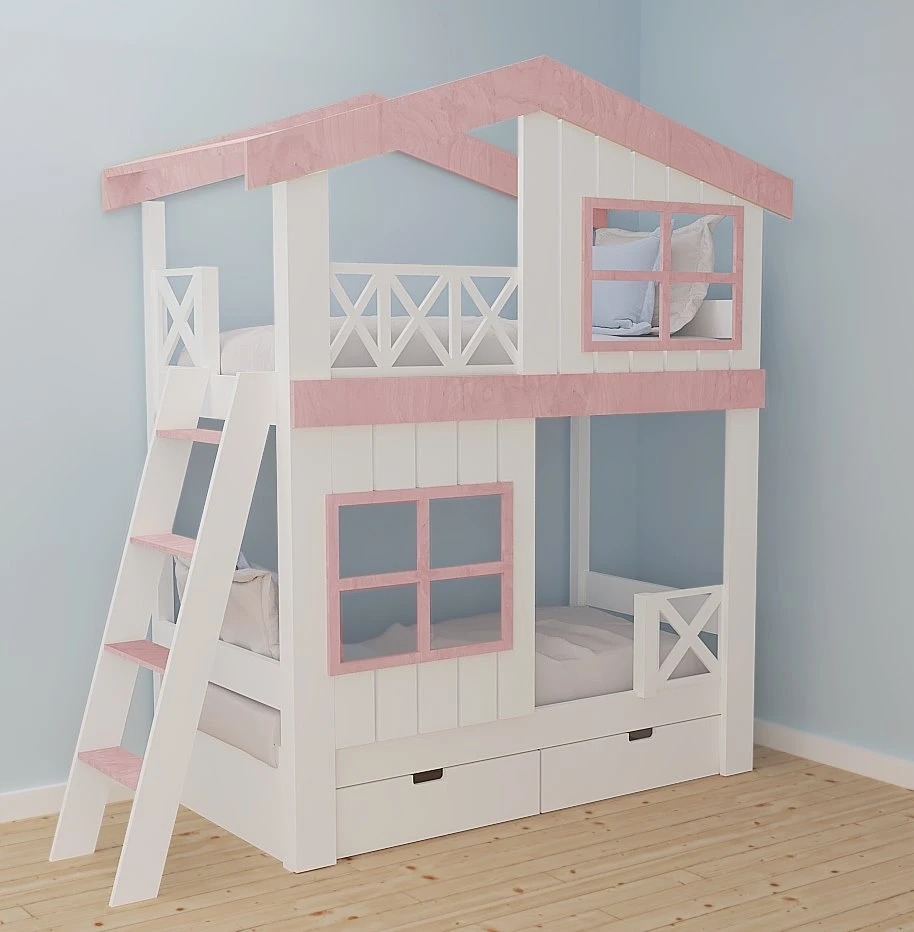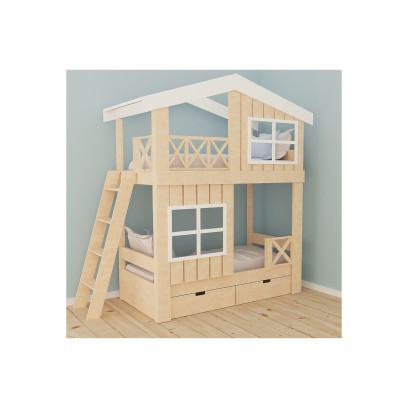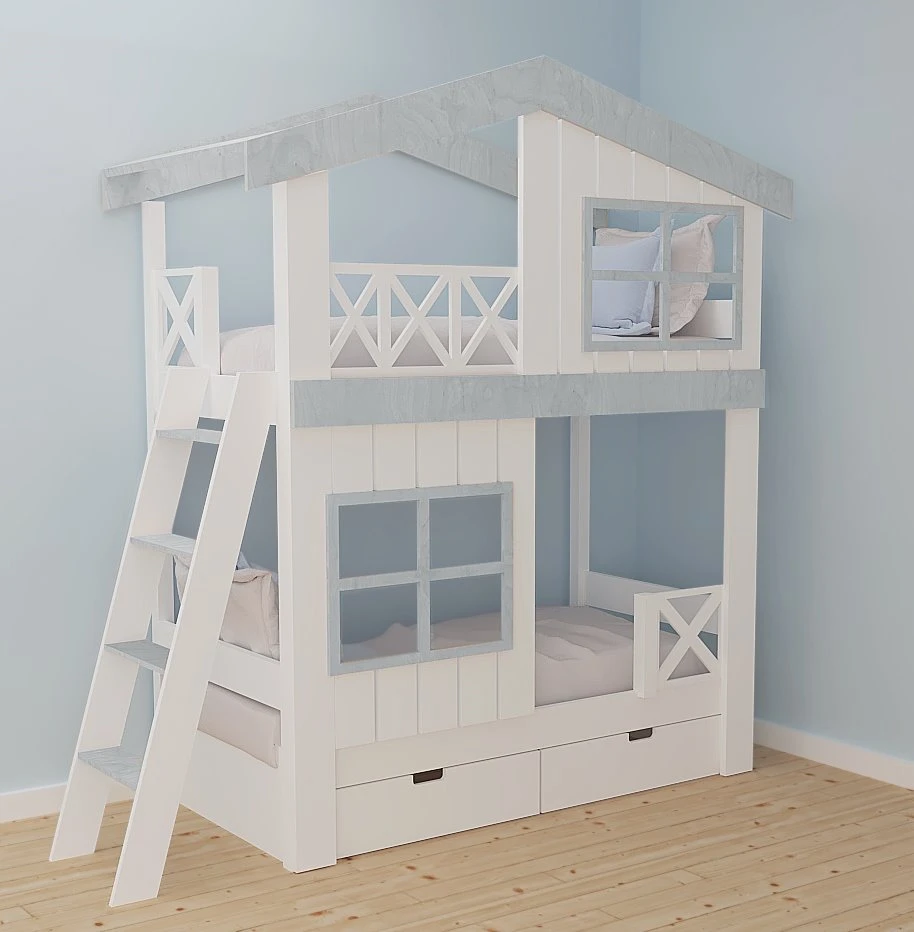 Projekt domku odwołuje się do archetypicznych marzeń dzieci – bezpiecznej przestrzeni tylko dla nich, w której mogą spać, bawić się i rozwijać wyobraźnię. Neutralna baza kolorystyczna konstrukcji pozwala na dopasowanie dodatków (tekstylia, oświetlenie, dekoracje) zgodnie z charakterem pokoju – zarówno dla dziewczynki w pastelowym stylu, jak i dla chłopca w marynistycznej aranżacji.
