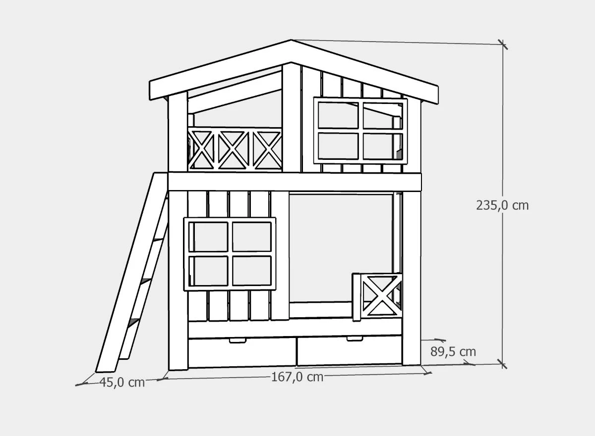 Łóżeczka piętrowe dla dzieci od zawsze były sposobem na oszczędność miejsca, ale w przypadku tego modelu funkcjonalność spotyka się z designem, który odmienia wnętrze. Piętrowe łóżko z drabinką w formie domku to rozwiązanie, które sprawia, że pokój dziecka staje się nie tylko sypialnią, ale także przestrzenią twórczej zabawy. Uroczy daszek, stylowe okienka i dekoracyjny płotek tworzą bajkowy klimat, w którym każde dziecko poczuje się wyjątkowo.