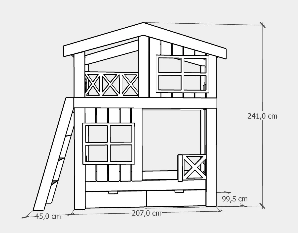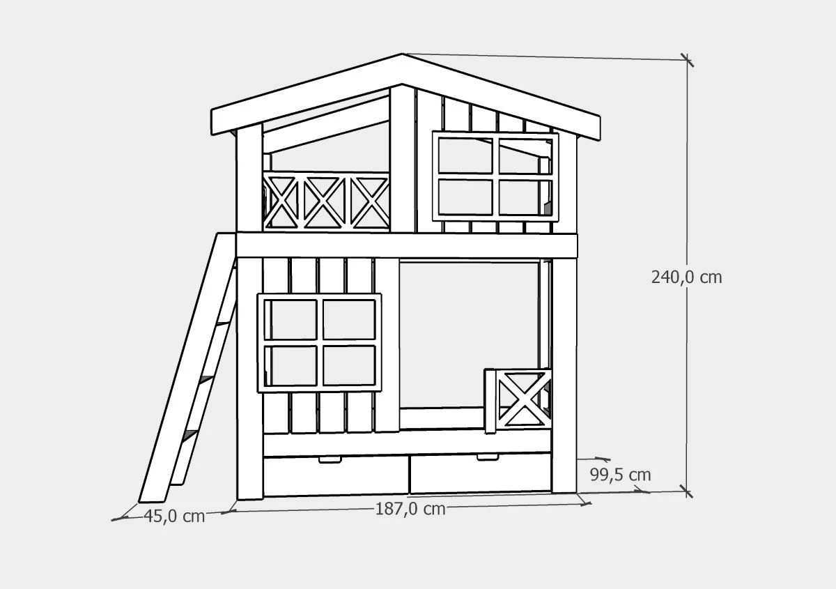 Pod dolnym łóżkiem znajduje się przestrzeń, którą można dopasować do swoich potrzeb. Do wyboru są dwie pojemne szuflady na zabawki i tekstylia lub jedna szuflada ze stelażem pod dodatkowy materac, co pozwala zamienić domek w łóżko trzyosobowe – idealne rozwiązanie dla rodzeństwa lub na nocowanie kolegów i koleżanek.