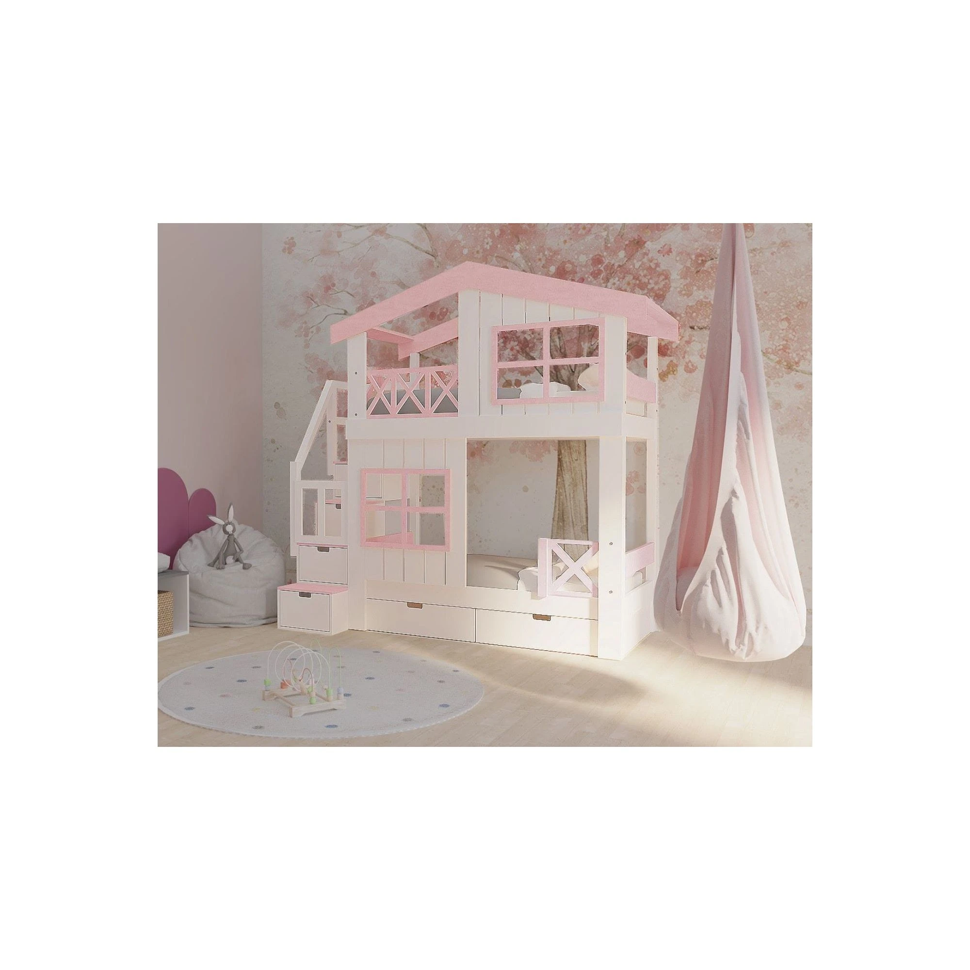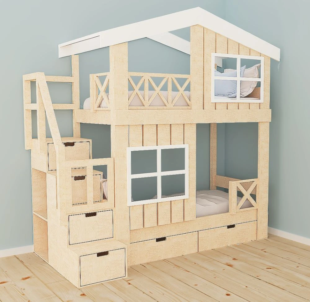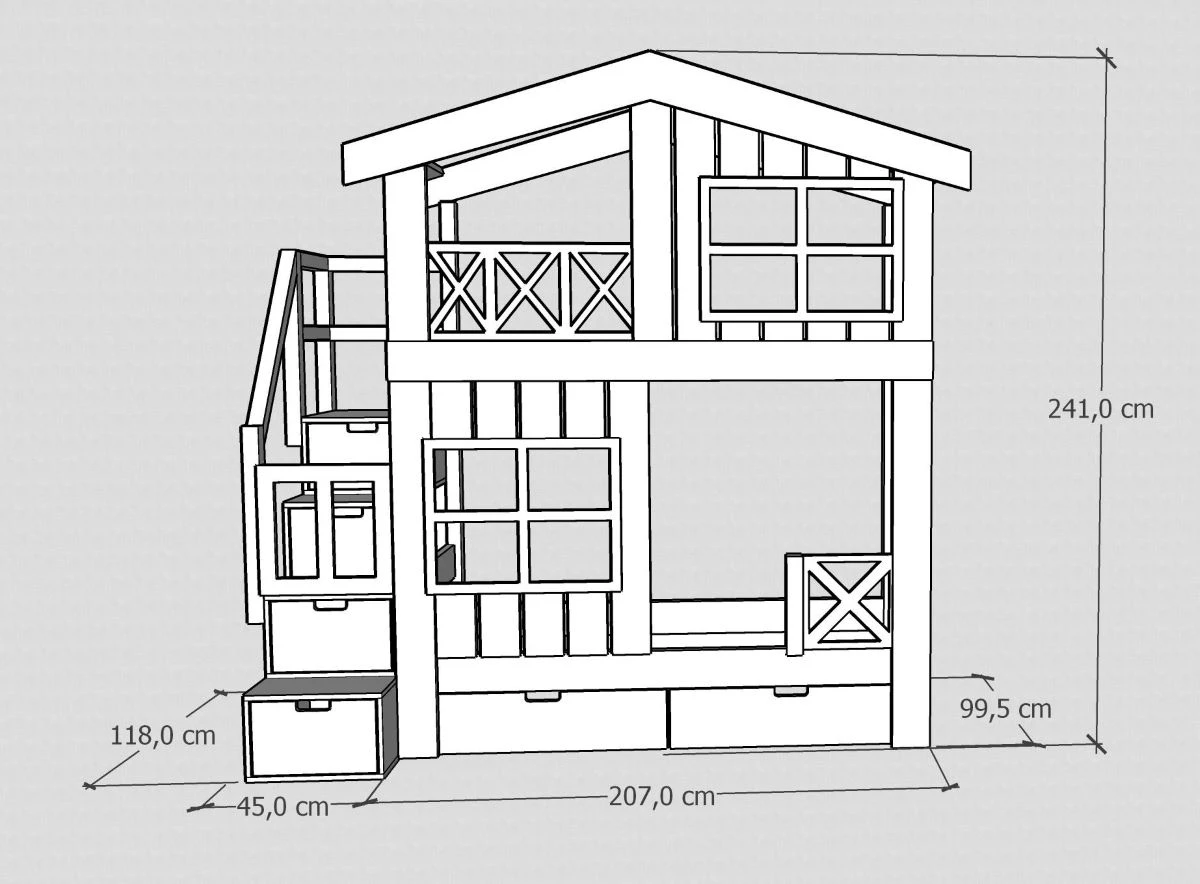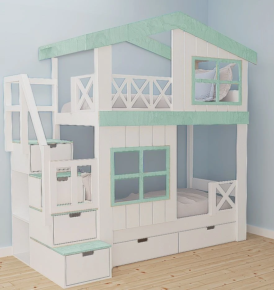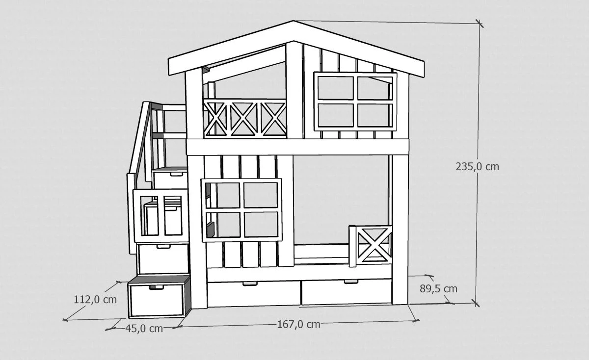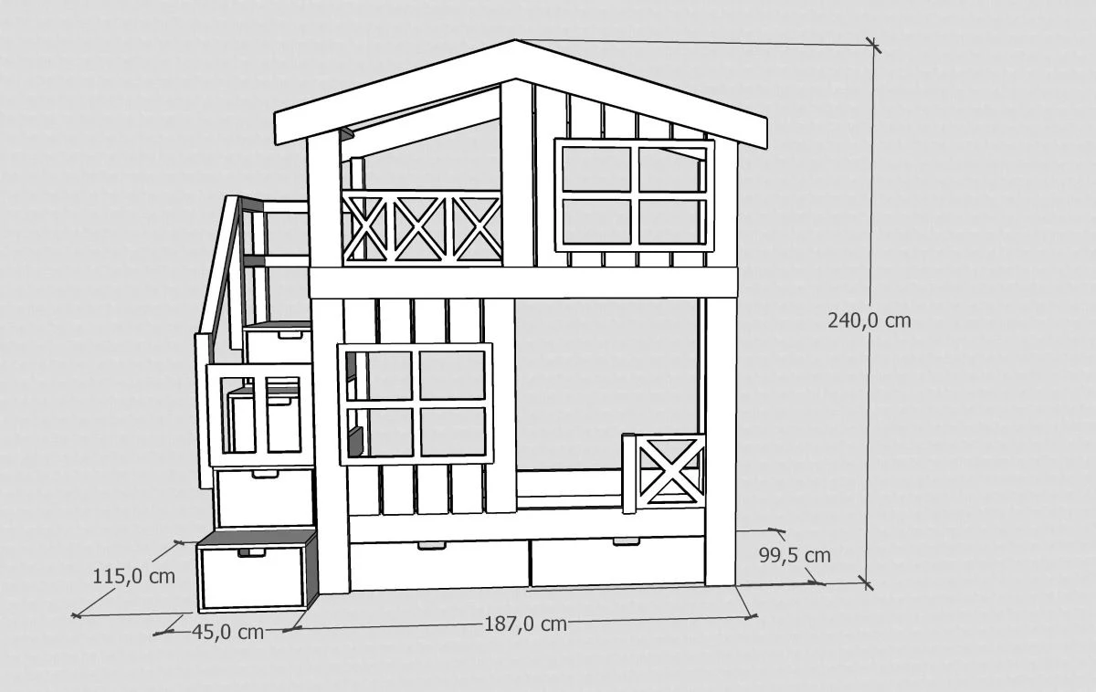 Piętrowe łóżko ze schodami w formie domku to połączenie funkcjonalności, bezpieczeństwa i wyjątkowego designu. Inspirowane marzeniami dzieci o własnym domku, tworzy w pokoju nie tylko miejsce do spania, ale też prywatną przestrzeń do zabawy i odpoczynku. Dzięki starannie zaprojektowanym detalom – płotkowi, okienkom i daszkowi – łóżko piętrowe staje się centralnym punktem aranżacji pokoju dziecięcego.