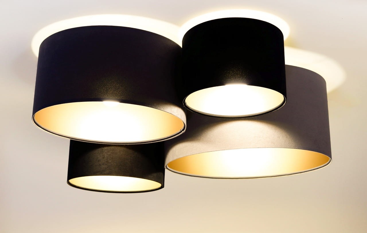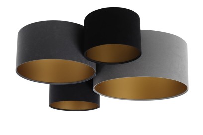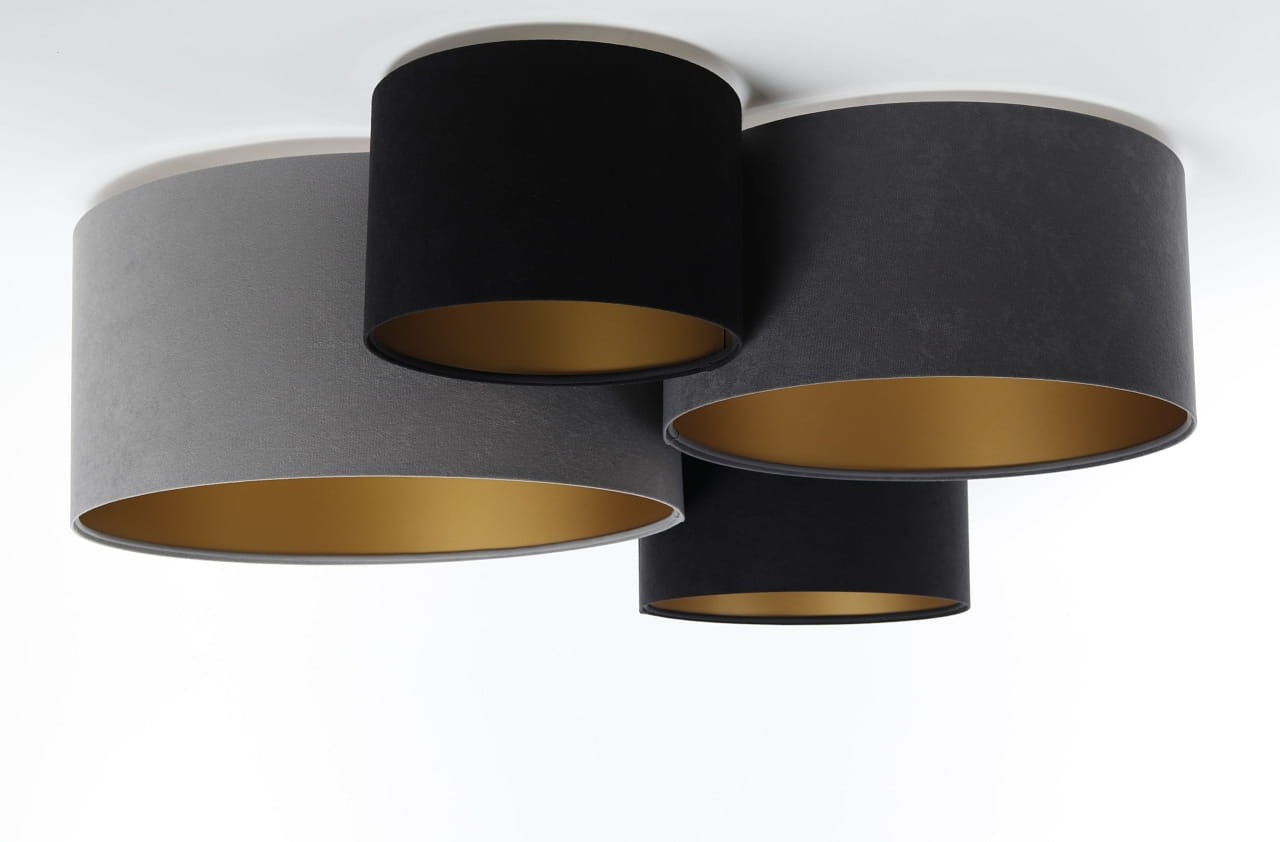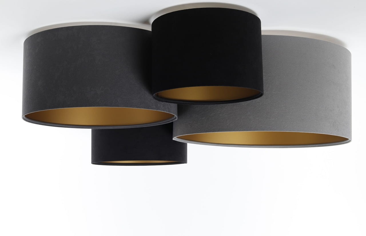 Poczwórny plafon o nowoczesnym designie. Kompozycja czterech abażurów w kształcie walcy o różnych średnicach i wysokościach, tworzących ciekawy i harmonijny układ. Plafon instalowany pod samym sufitem, dzięki czemu nie zabiera optycznie przestrzeni, sprawdzi się również w pokojach o mniejszych metrażach. Welurowe abażury w kolorach czerni, grafitu i szarości wewnątrz wyłożone zostały złotą folią, która w podświetleniu daje piękny poblask. Abażury odporne są na działania promieni UV, a tkanina nie ulega blaknięciu w czasie użytkowania.