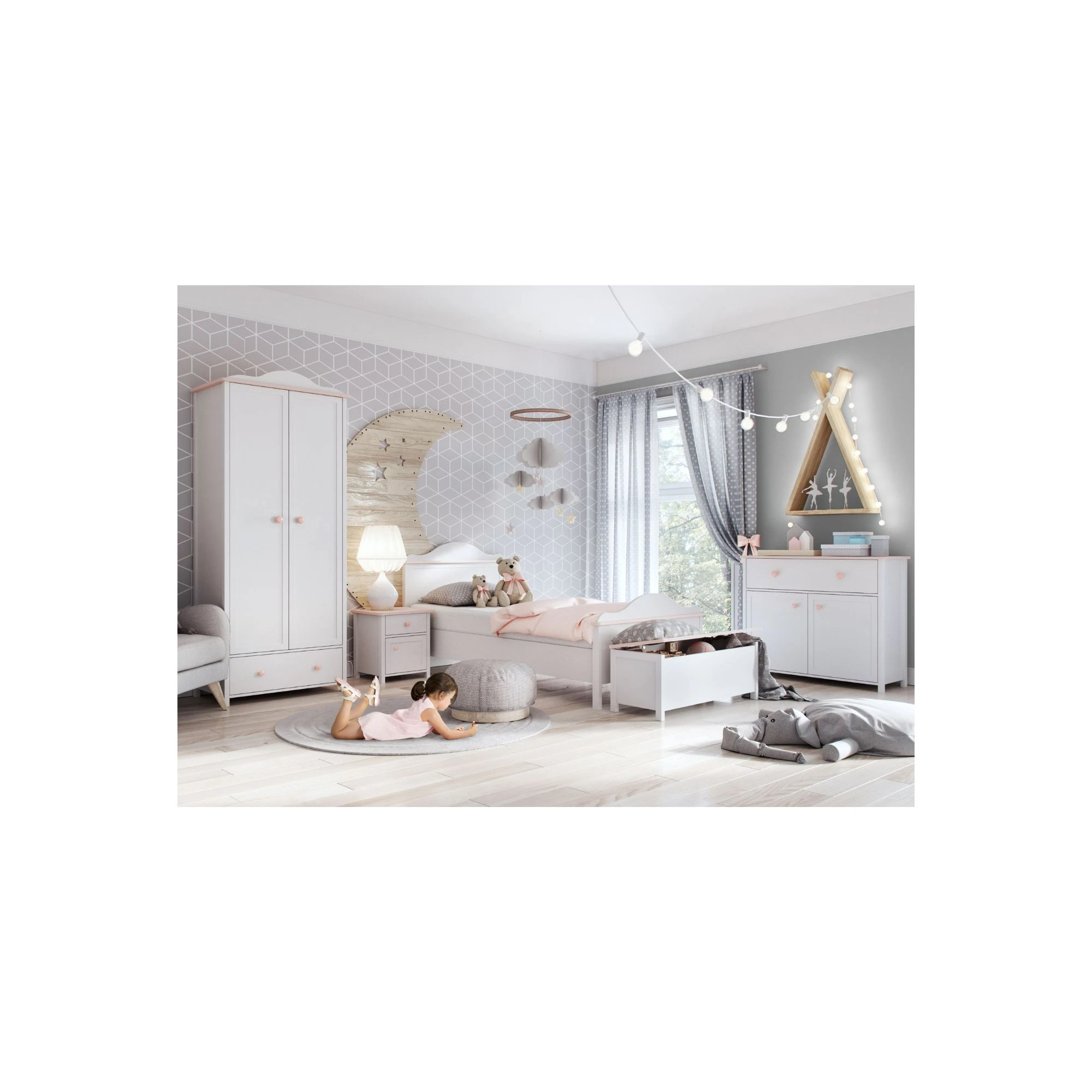 W centrum aranżacji znajduje się łóżko z materacem Luna, które zapewnia wygodny sen i bezpieczny odpoczynek. Towarzyszy mu szafka nocna oraz pojemna skrzynia na zabawki i pościel, która pomaga utrzymać porządek. Na ubrania i drobiazgi świetnie sprawdza się szafa dwudrzwiowa Luna oraz praktyczna komoda. Dzięki temu pokój pozostaje przestronny i pełen miejsca na zabawę – dywan staje się centrum kreatywności małej dziewczynki.