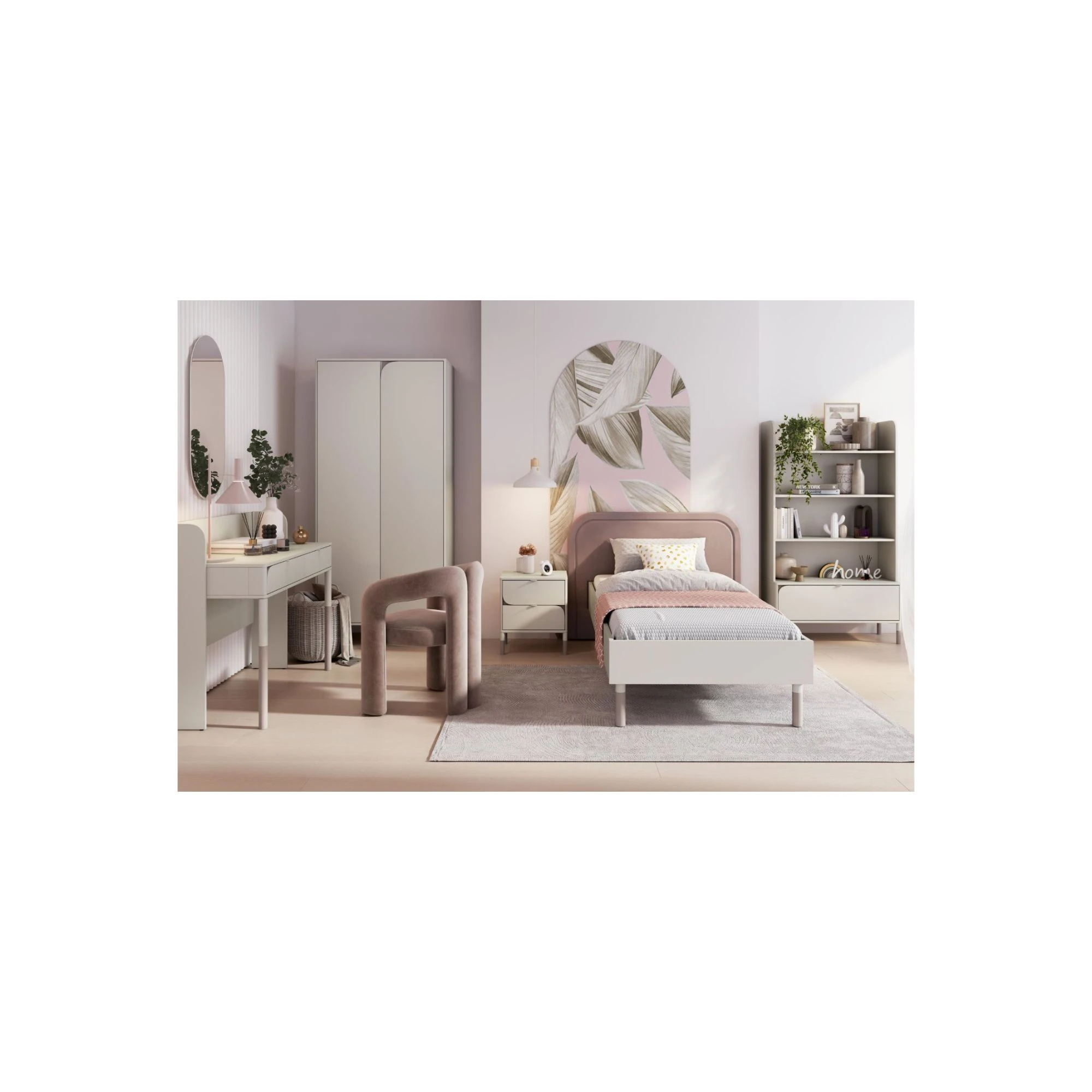 Stwórz wyjątkową przestrzeń dla swojej córki z kolekcją mebli Harmony – idealną dla starszych dziewczynek i nastolatek, które cenią styl, funkcjonalność i komfort. W tej aranżacji znajdziesz wszystko, czego potrzebuje dwunastolatka: szafę, regał, łóżko 90x200, szafkę nocną, biurko oraz lustro owalne, tworzące spójny i harmonijny wystrój.