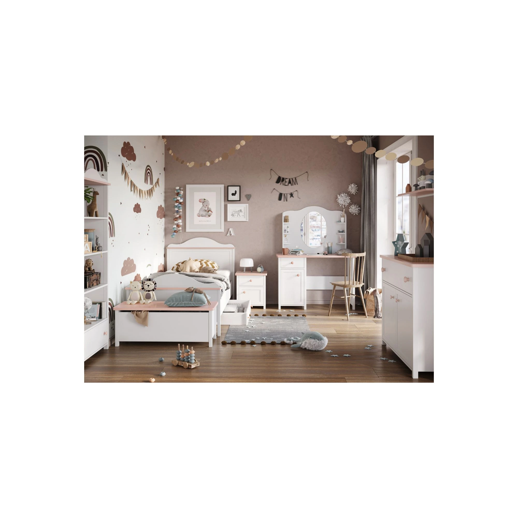 Pokój dziewczynki Luna – kompletny zestaw białych mebli z pudrowym różem