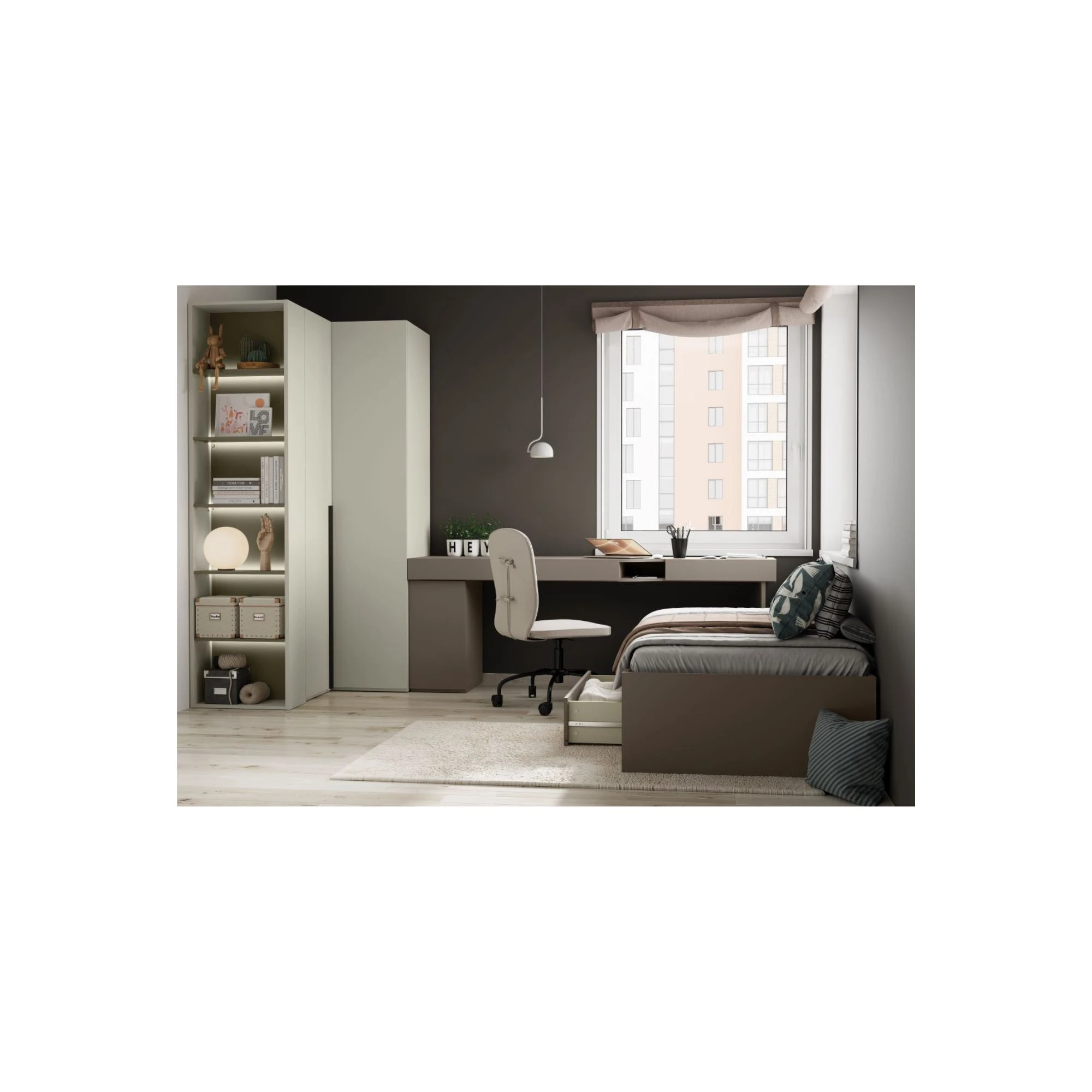 Ta aranżacja z kolekcji WOOW pokazuje, że nawet niewielka przestrzeń może być maksymalnie funkcjonalna i stylowa. Zestaw mebli został zaprojektowany tak, by zapewnić komfortową strefę do nauki, odpoczynku i przechowywania — bez kompromisów estetycznych.