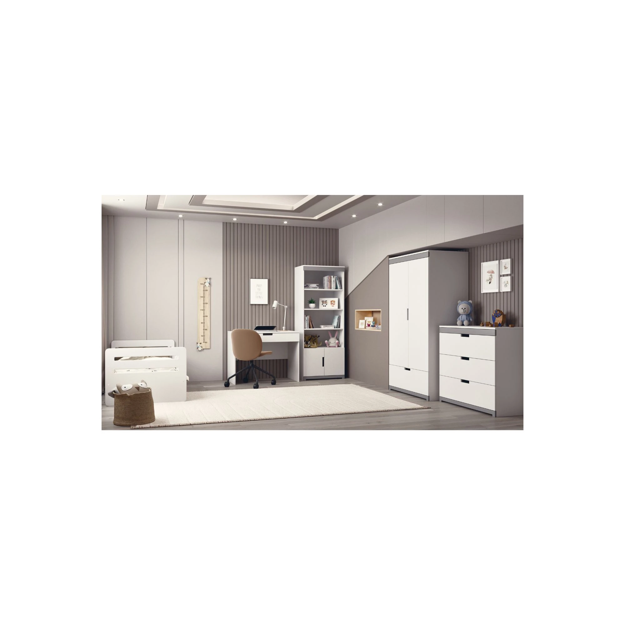 W projekcie pokoju młodzieżowego ustawiono meble z kolekcji Tomi w kolorze białym, z ozdobnym szarym elementem. Cena obejmuje: