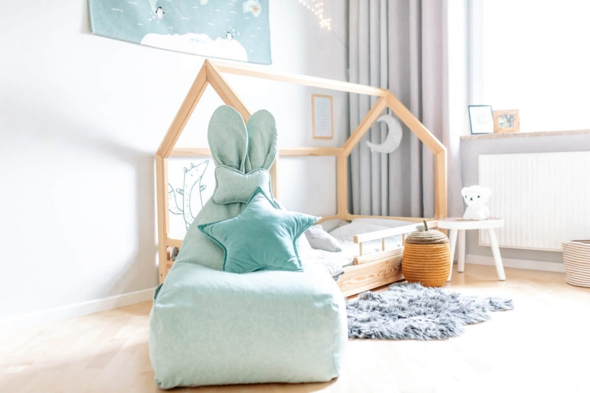 Puf zielonomiętowy Funny Bunny to niezwykle wygodny mebelek do siedzenia, pasujący do każdego pokoju dziecięcego. Obszerne siedzisko zapewnia duży komfort podczas siedzenia, a nieco węższe oparcie, zakończone cudownymi uszami - idealne podparcie dla pleców. Kokardka Bunny to niewielka poduszeczka, którą można zdjąć, a uszy zawsze pozostaną pionowe dzięki usztywnieniu z pianki styropianowej. Po obu stronach siedziska znajdują się kieszonki, w których schować można najważniejsze przedmioty i skarby. Kształt pufa oraz styropianowe wypełnienie idealnie dopasowują się do ciała dziecka gwarantując mu wygodną pozycję.