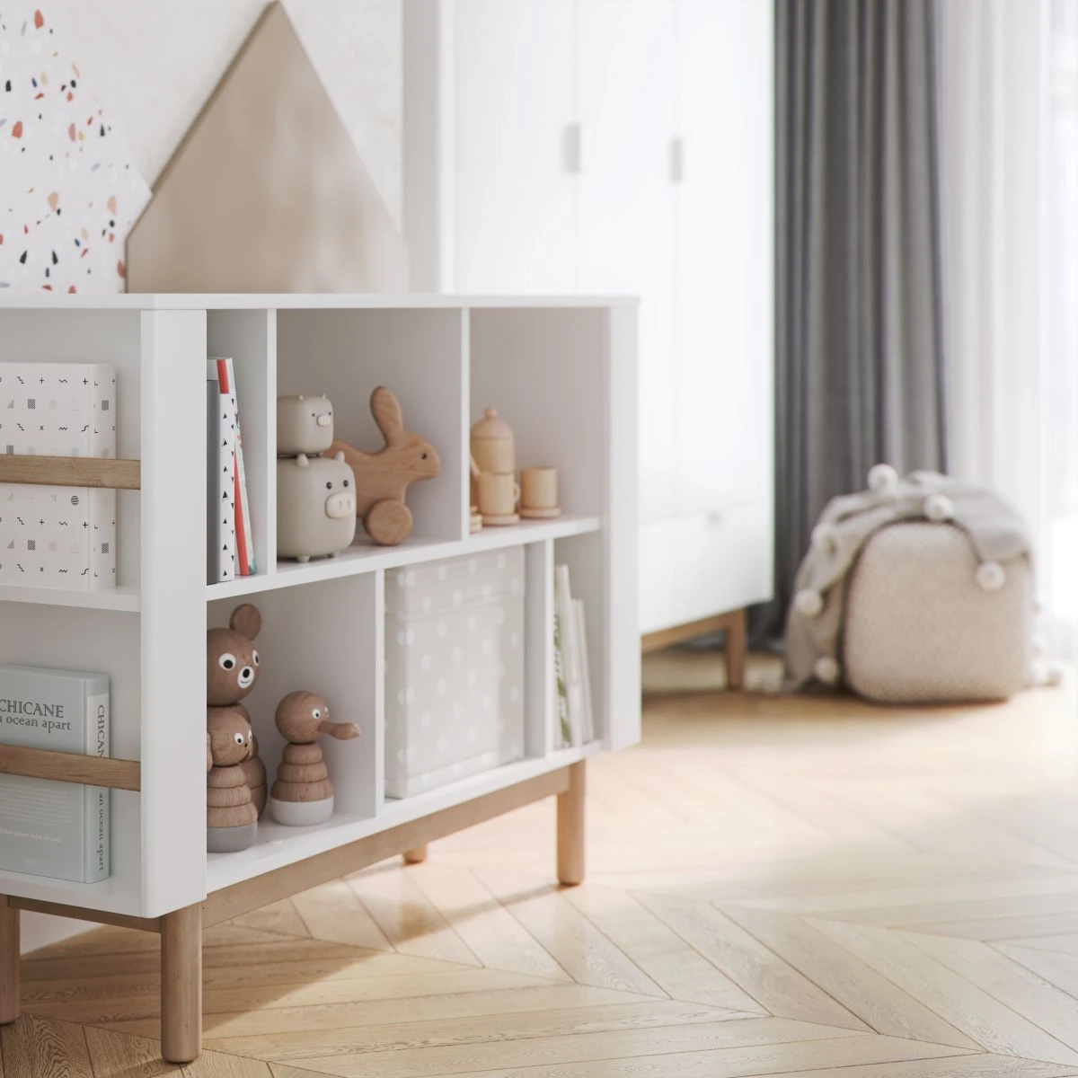 Regał oferuje dwie otwarte półki wzdłuż lewego boku – doskonałe na książki i większe akcesoria – oraz cztery mniejsze półki po prawej stronie, idealne do przechowywania drobiazgów: figurek, samochodzików czy dekoracji. Dzięki takiej konstrukcji mebel pomaga w nauce porządku i organizacji od najmłodszych lat. Niewielka wysokość sprawia, że dziecko ma łatwy dostęp do swoich rzeczy, co wspiera jego samodzielność.