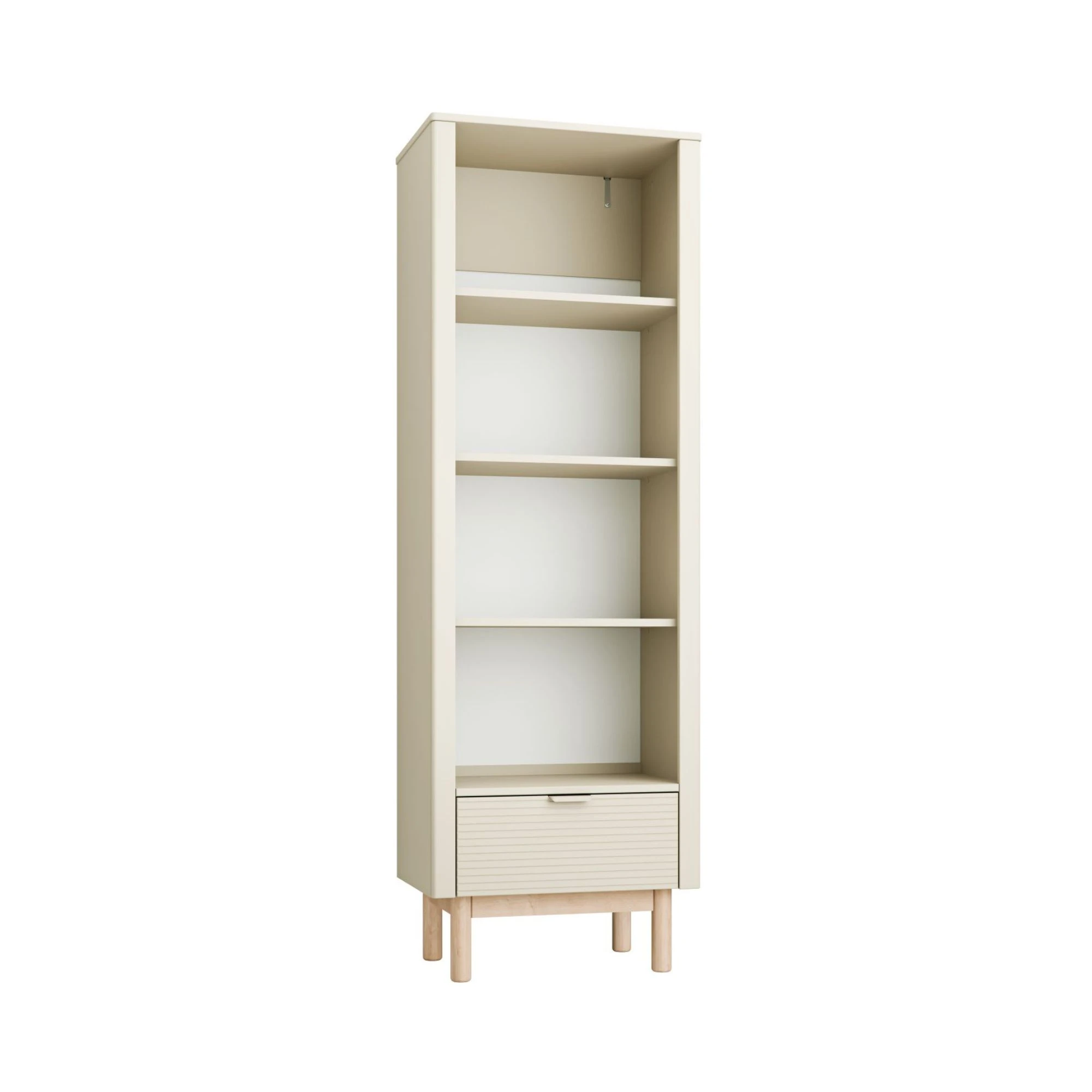 Fronty w kolorze szampańskim, delikatne ryflowania i drewniane nóżki z buku nadają regałowi lekkości i elegancji. To mebel, który świetnie komponuje się z naturalnymi dodatkami, pastelami czy dekoracjami w mocniejszych barwach, dzięki czemu pasuje zarówno do pokoju chłopca, jak i dziewczynki.
