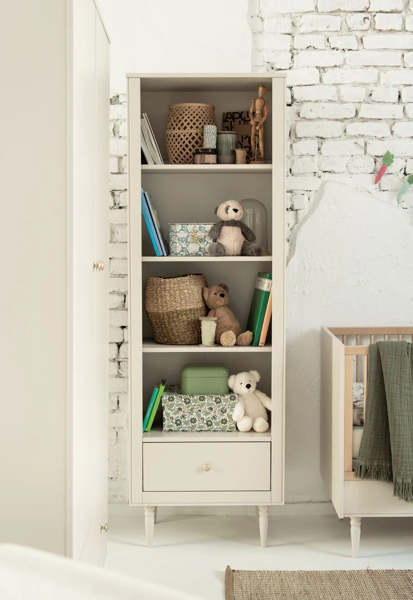Neutralny szampański odcień oraz eleganckie detale sprawiają, że regał Petite doskonale komponuje się zarówno w pokoju chłopca, jak i dziewczynki. Jego smukła forma dodaje wnętrzu lekkości, a jednocześnie zapewnia sporo miejsca do przechowywania i eksponowania dziecięcych skarbów.