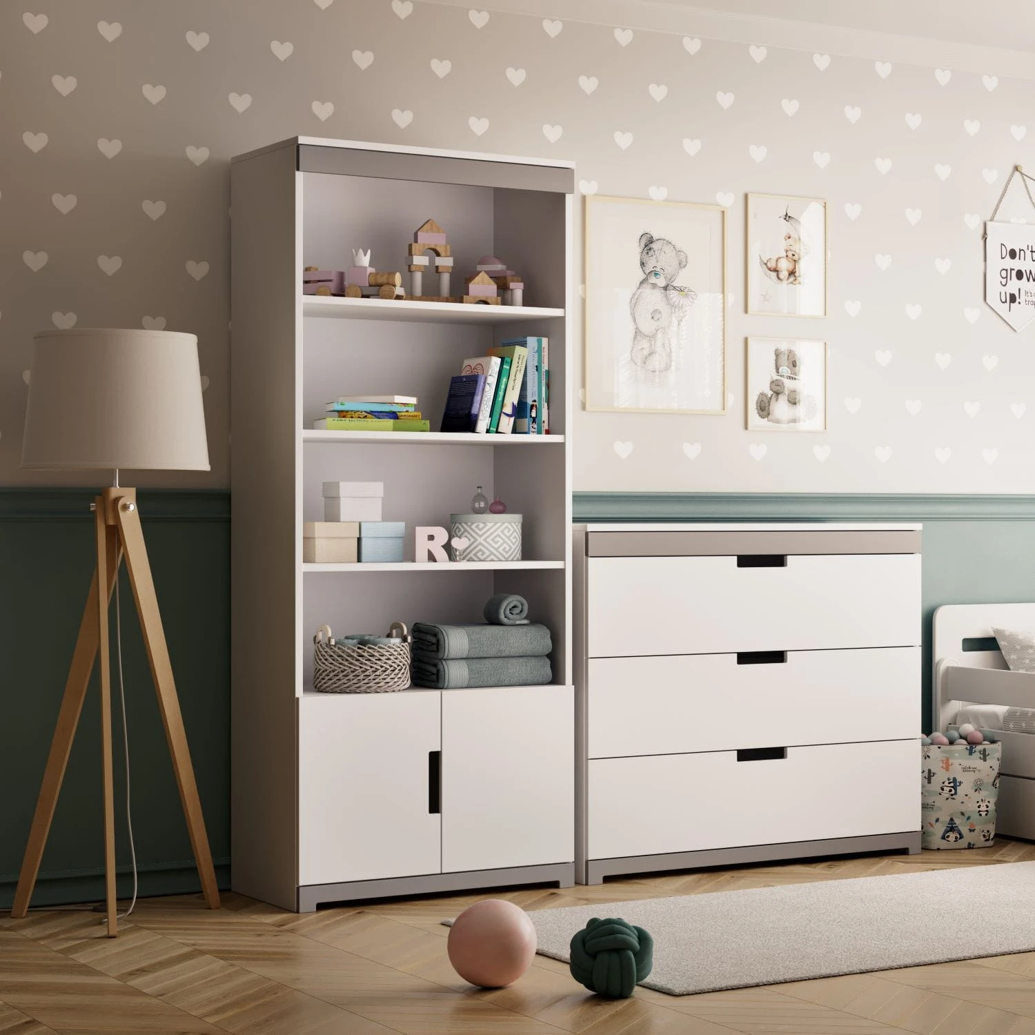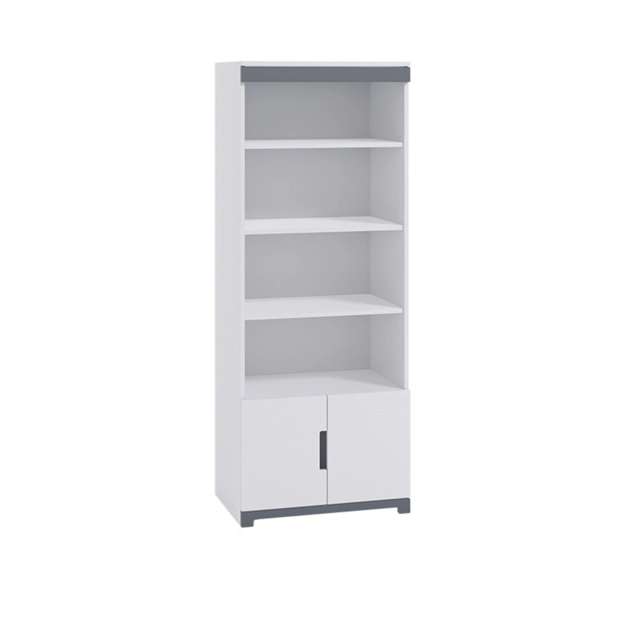 Regał dla chłopca, który charakteryzuje prostota i funkcjonalność. Otwarte półki i gładki, biały front szafki podkreślają wyfrezowane ergonomiczne uchwyty oraz ozdobne elementy w kolorze szarym. Regał, na którym ułożyć można zabawki i książki pasuje do pokoju chłopca i nastolatka.