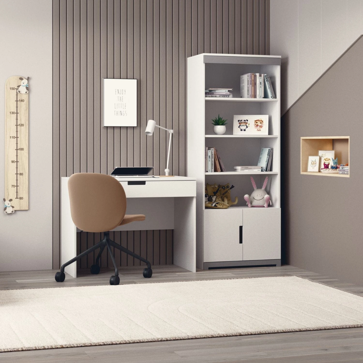Regał Tomi wykonany jest z wysokiej jakości płyty laminowanej oraz lakierowanej płyty MDF. Dostępny w uniwersalnym białym kolorze pasuje do każdego wystroju. Cztery otwarte półki i zamykana szafka w dolnej części mebla zapewnią miejsce na wszystkie skarby dziecka. Dla bezpieczeństwa mebel wyposażono w specjalne kątowniki mocujące do ściany i zwiększające jego stabilność.
