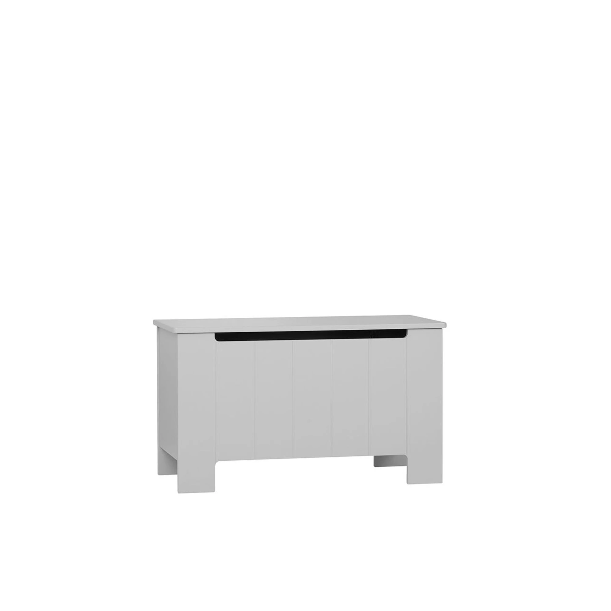 Fronty wykonano z malowanej płyty MDF, a korpus i elementy wewnętrzne z płyty laminowanej. Neutralny kolor szary sprawia, że skrzynia dopasuje się do różnych aranżacji – od kolorowych wnętrz dziecięcych po bardziej stonowane, młodzieżowe pokoje.