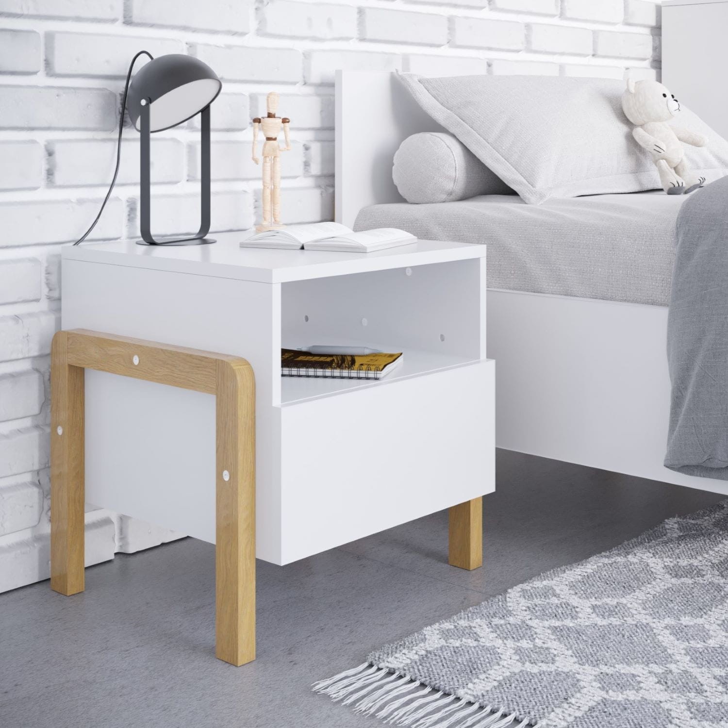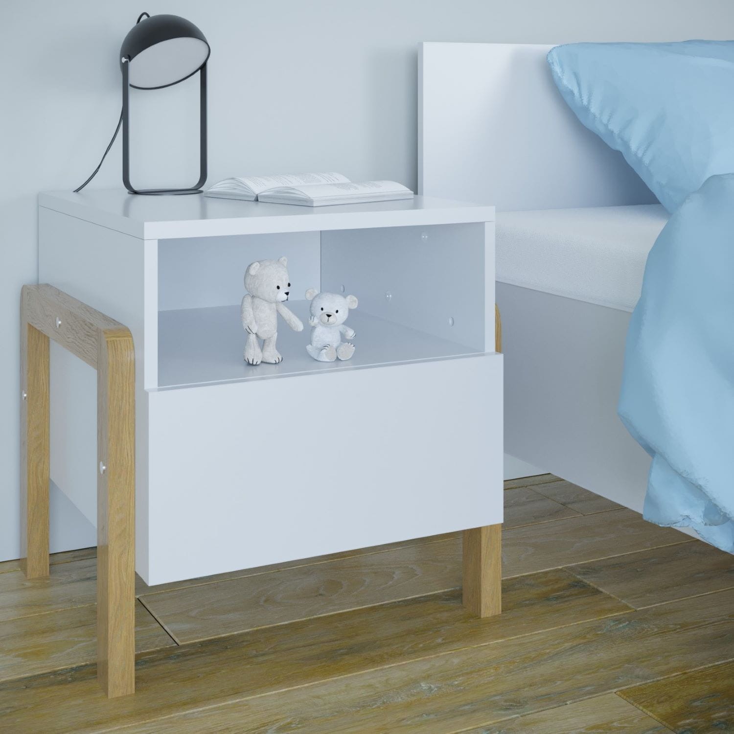Stolik do łóżka wpisujący się w trendy stylu skandynawskiego. Połączenie świeżej bieli ze szlachetnym drewnem dębowym tworzy ponadczasowe i naturalne piękno, pozwalające urządzić pokój dziecka w sposób nowoczesny i funkcjonalny.